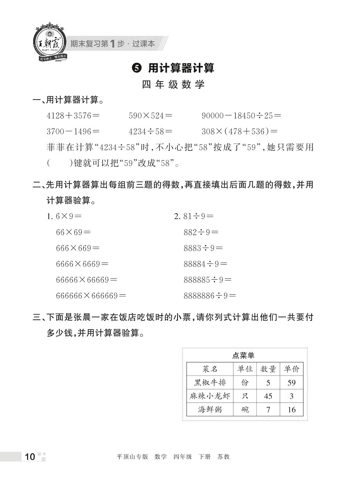 王朝霞期末过课本——5 用计算器计算四年级下册数学(苏教版)_R220408101742402