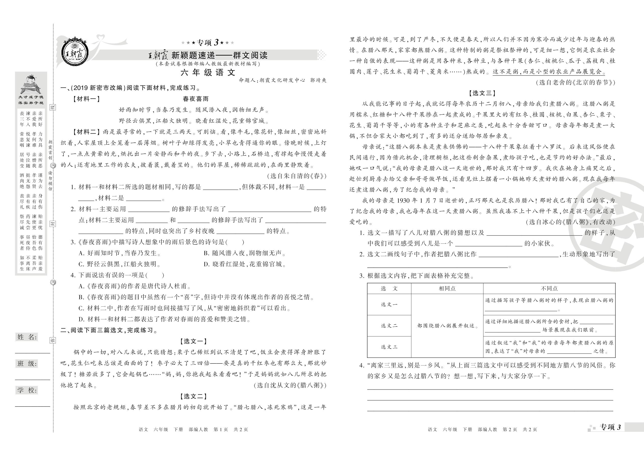 王朝霞期末专项卷——新颖题速递:群文阅读、古诗文阅读六年级下册语文(人教版)_R21080221803【0】