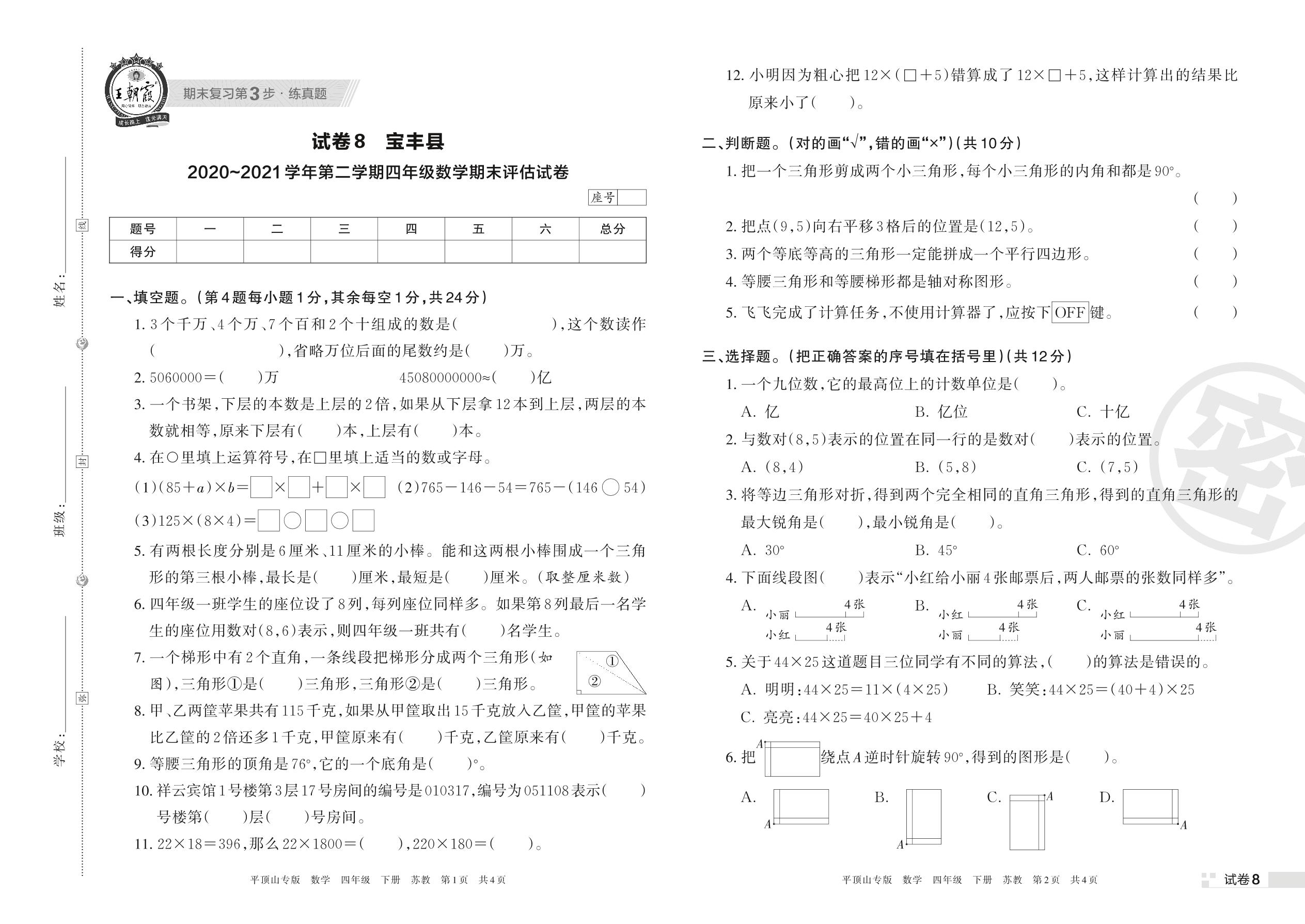 宝丰县2020~2021学年第二学期四年级数学期末评估试卷(苏教版)【8】