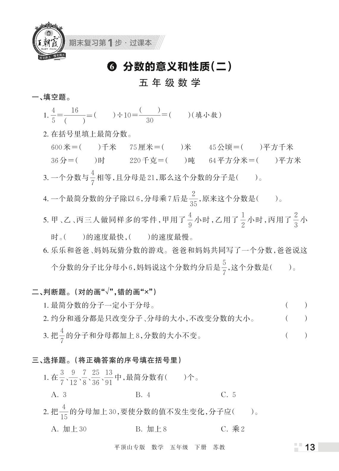 王朝霞期末过课本——6 分数的意义和性质(二)五年级下册数学(苏教版)_R220408102402687