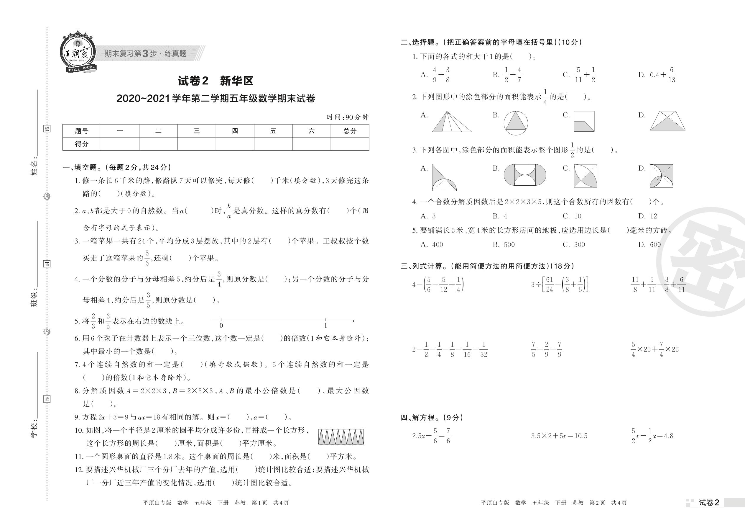 新华区2020~2021学年第二学期五年级数学期末试卷(苏教版)【2】