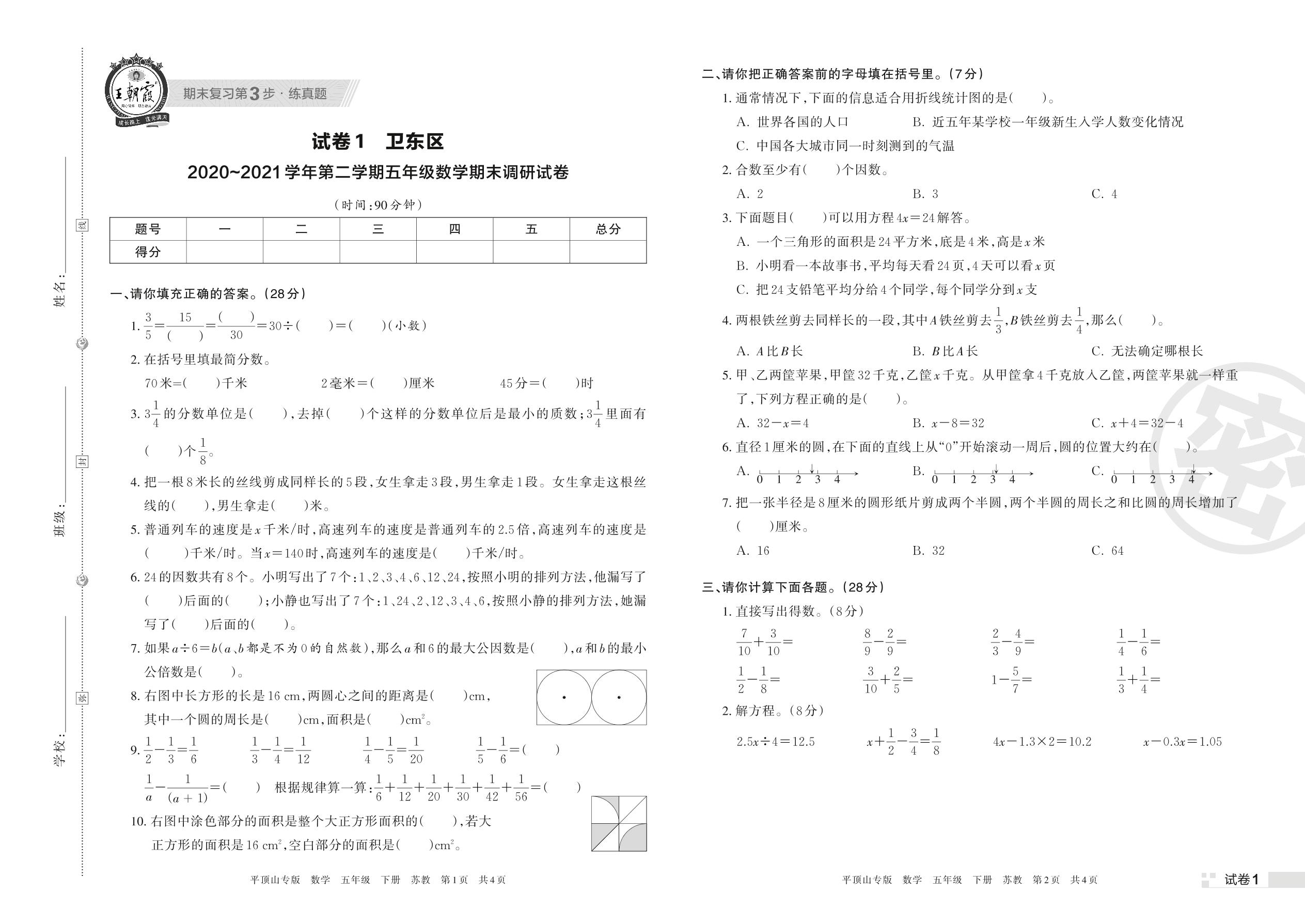 卫东区2020~2021学年第二学期五年级数学期末调研试卷(苏教版)【1】