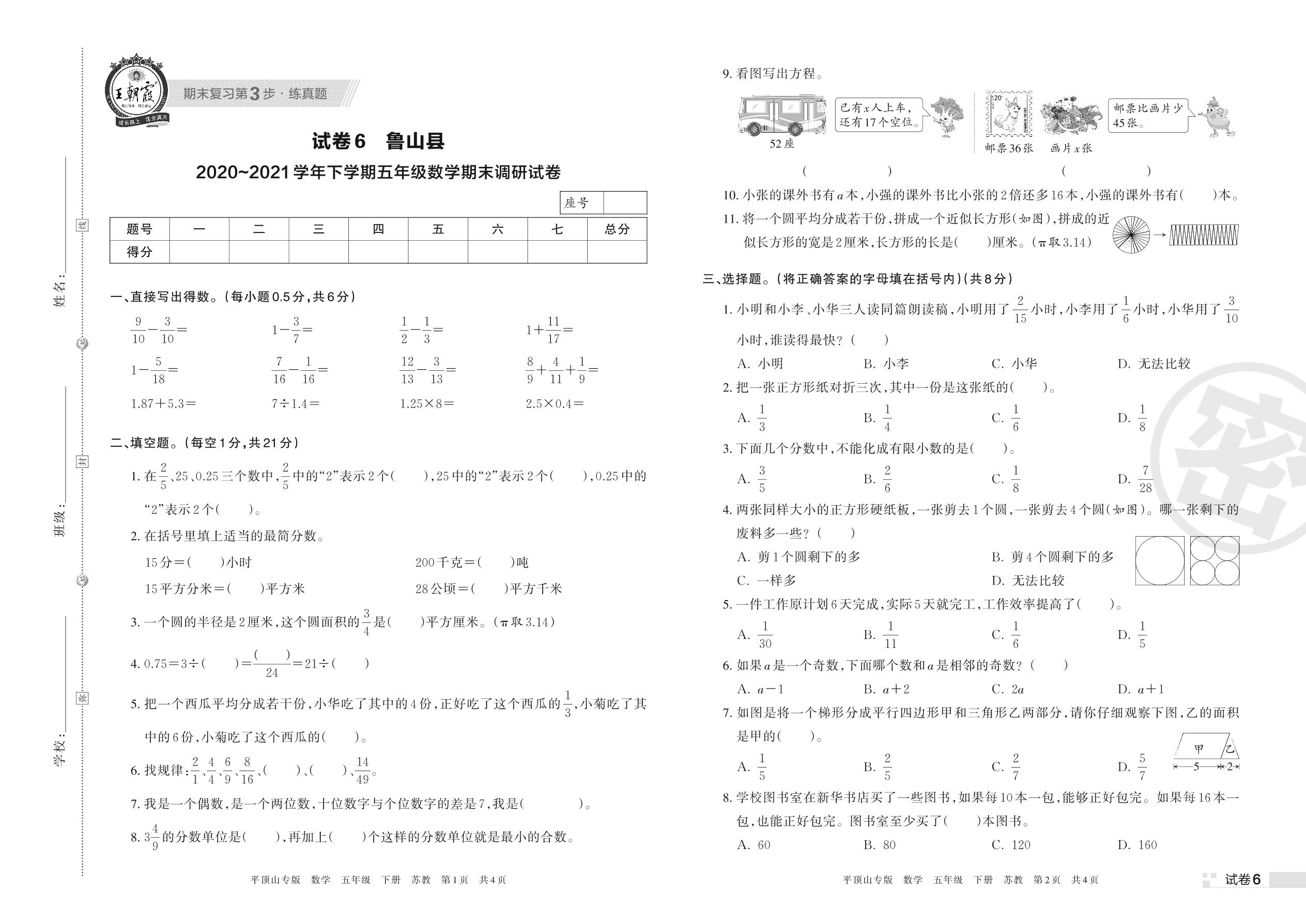 鲁山县2020~2021学年下学期五年级数学期末调研试卷(苏教版)【6】