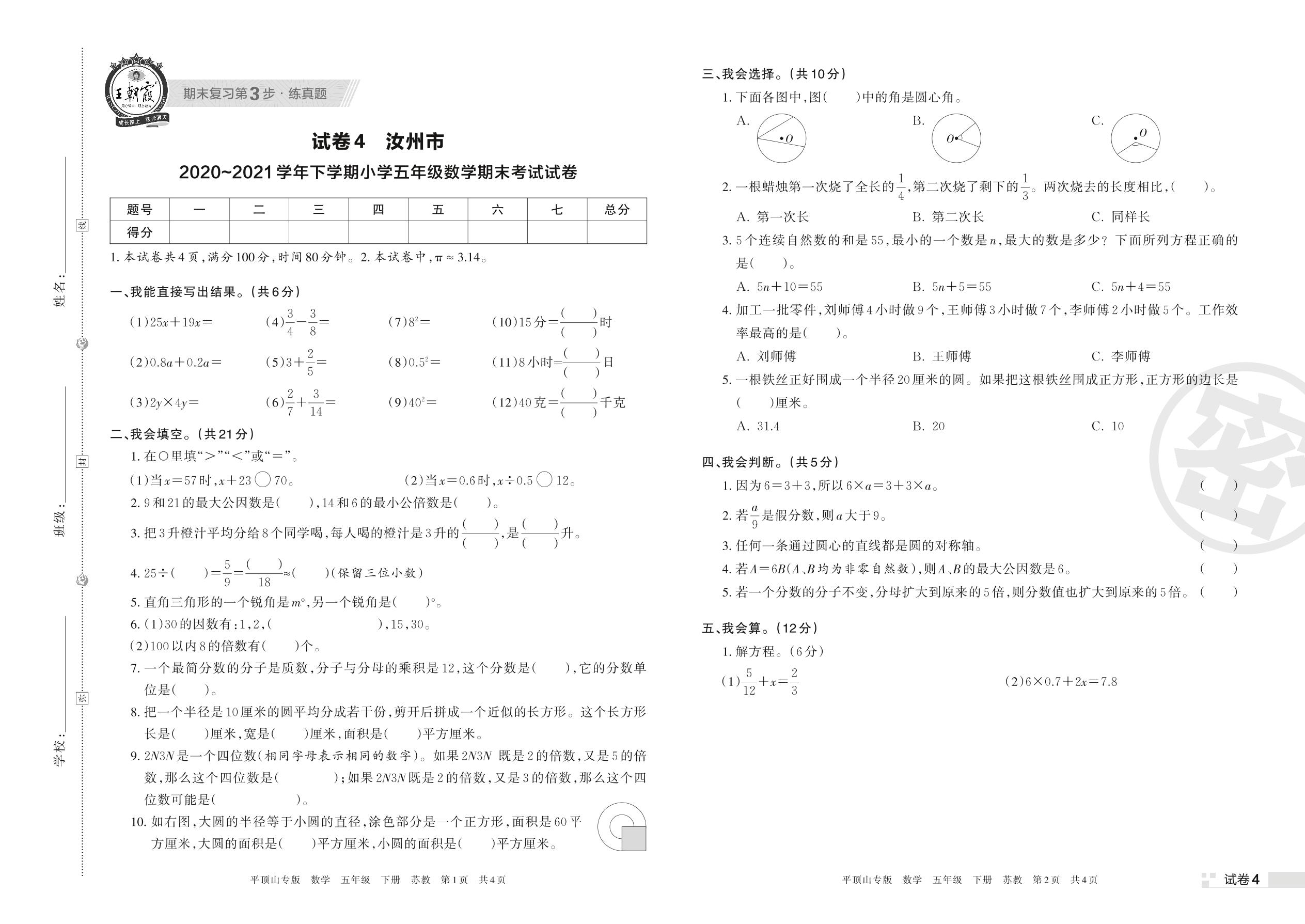 汝州市2020~2021学年下学期小学五年级数学期末考试试卷(苏教版)【4】