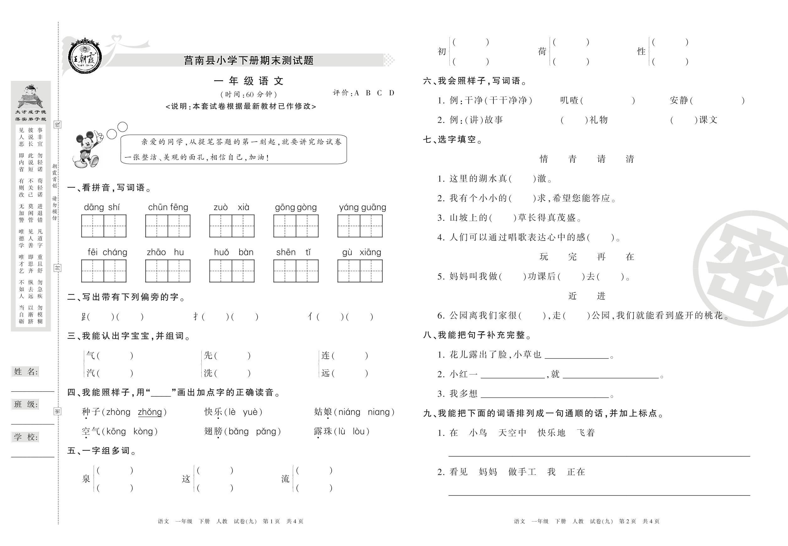 一年级语文人教版下册期末卷