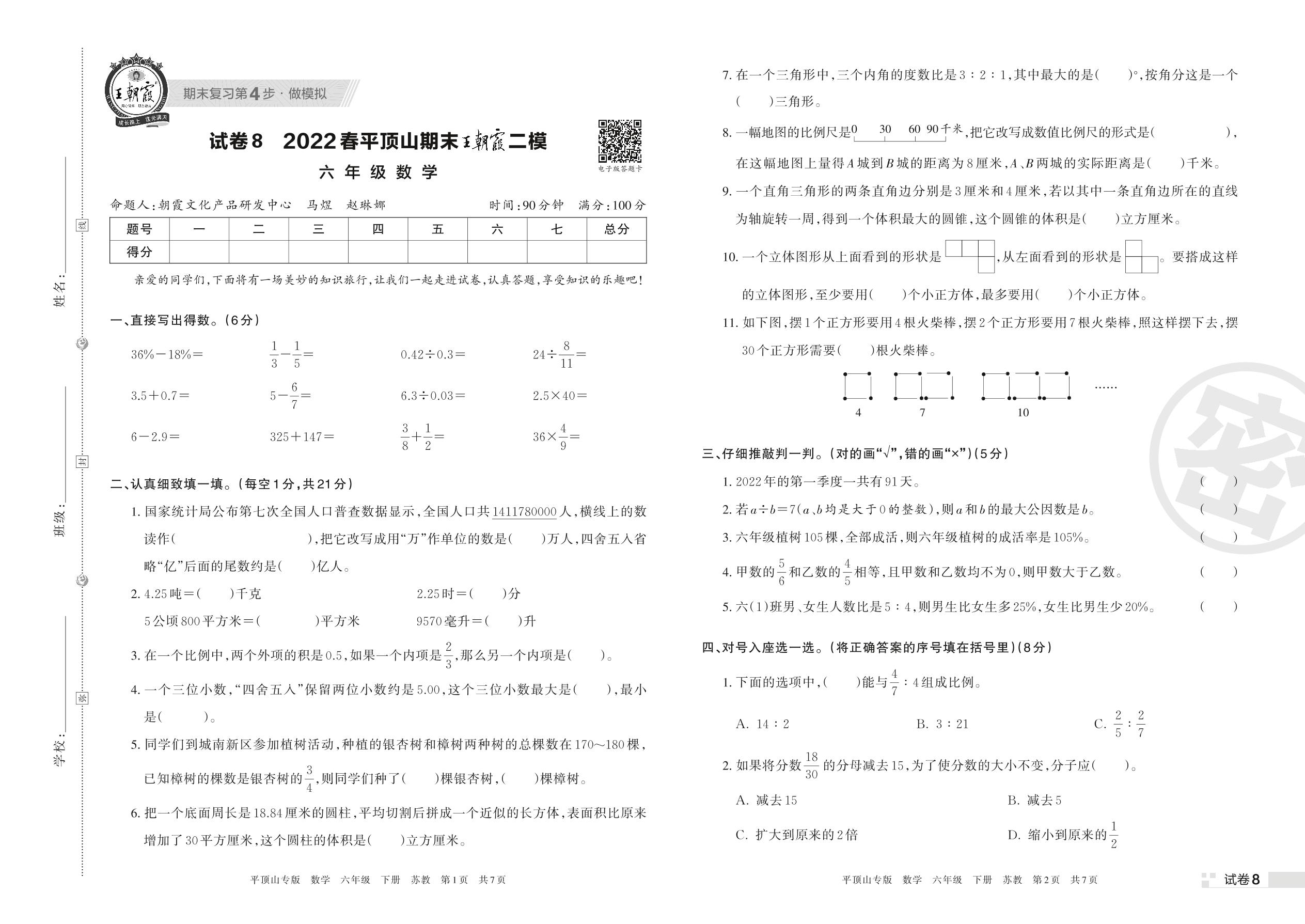 王朝霞期末模拟卷六年级下册数学(苏教版)_R220408102932101【8】
