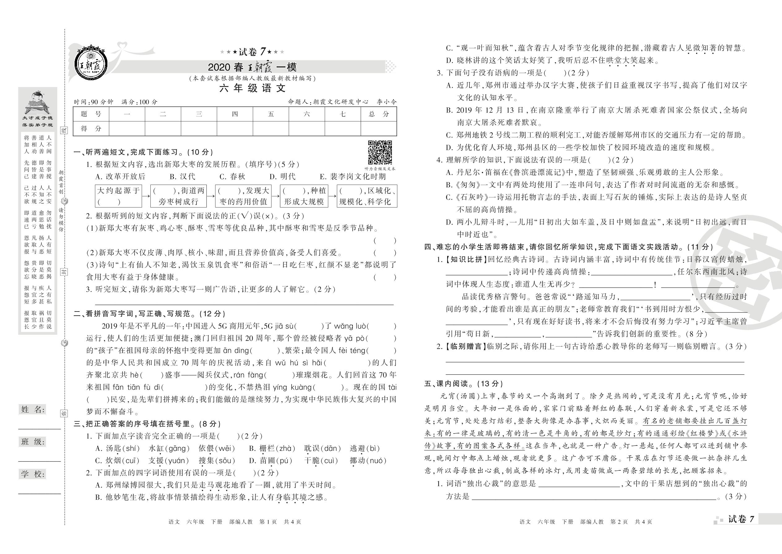 王朝霞期末模拟卷六年级下册语文(人教版)_R21080221840【7】