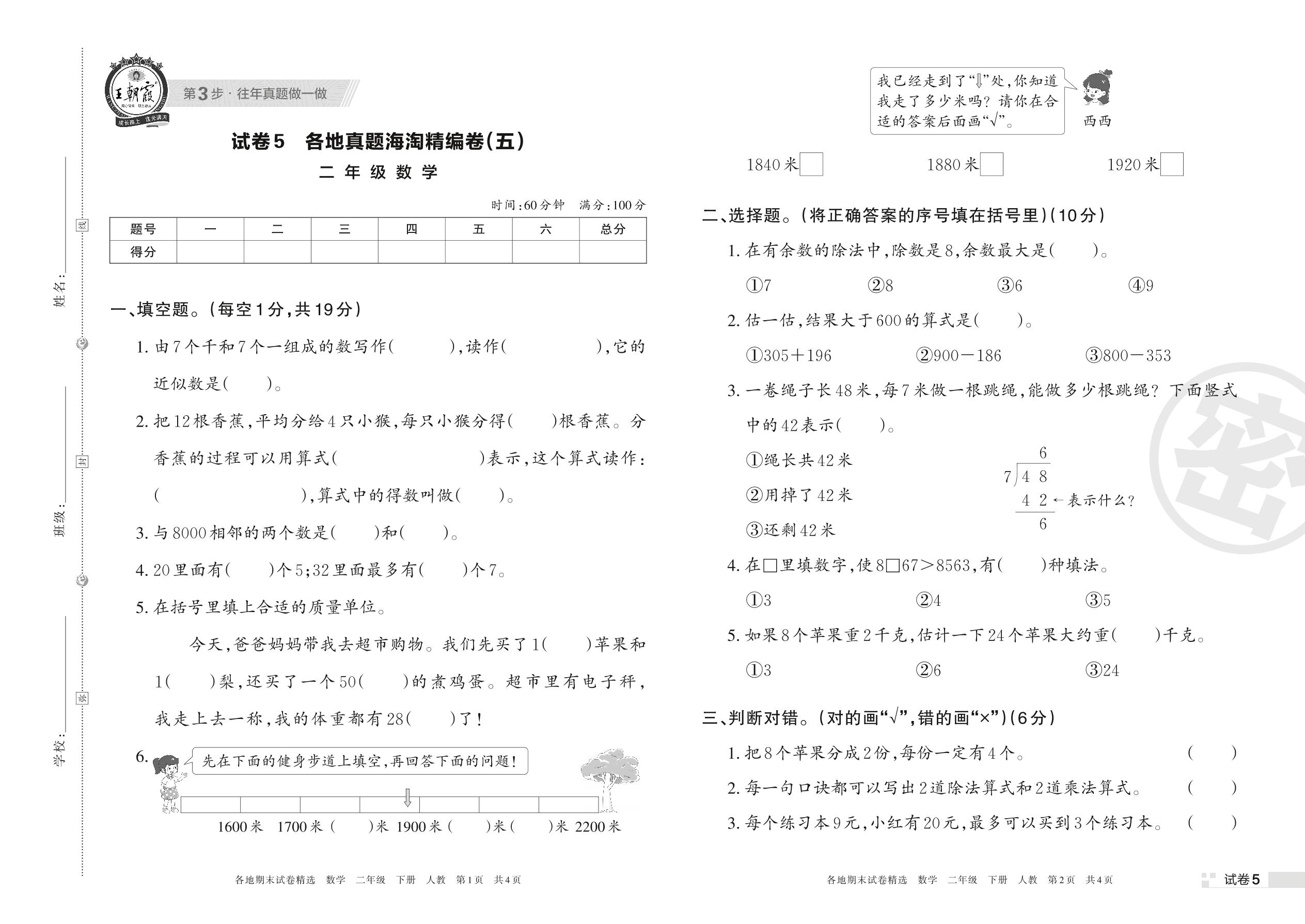 二年级数学人教版下册期末卷
