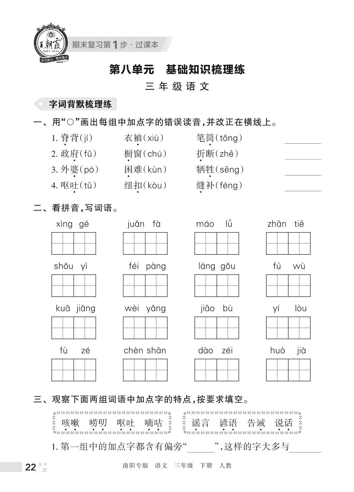 王朝霞期末过课本——第八单元 基础知识梳理练三年级下册语文(人教版)_R220408154603717