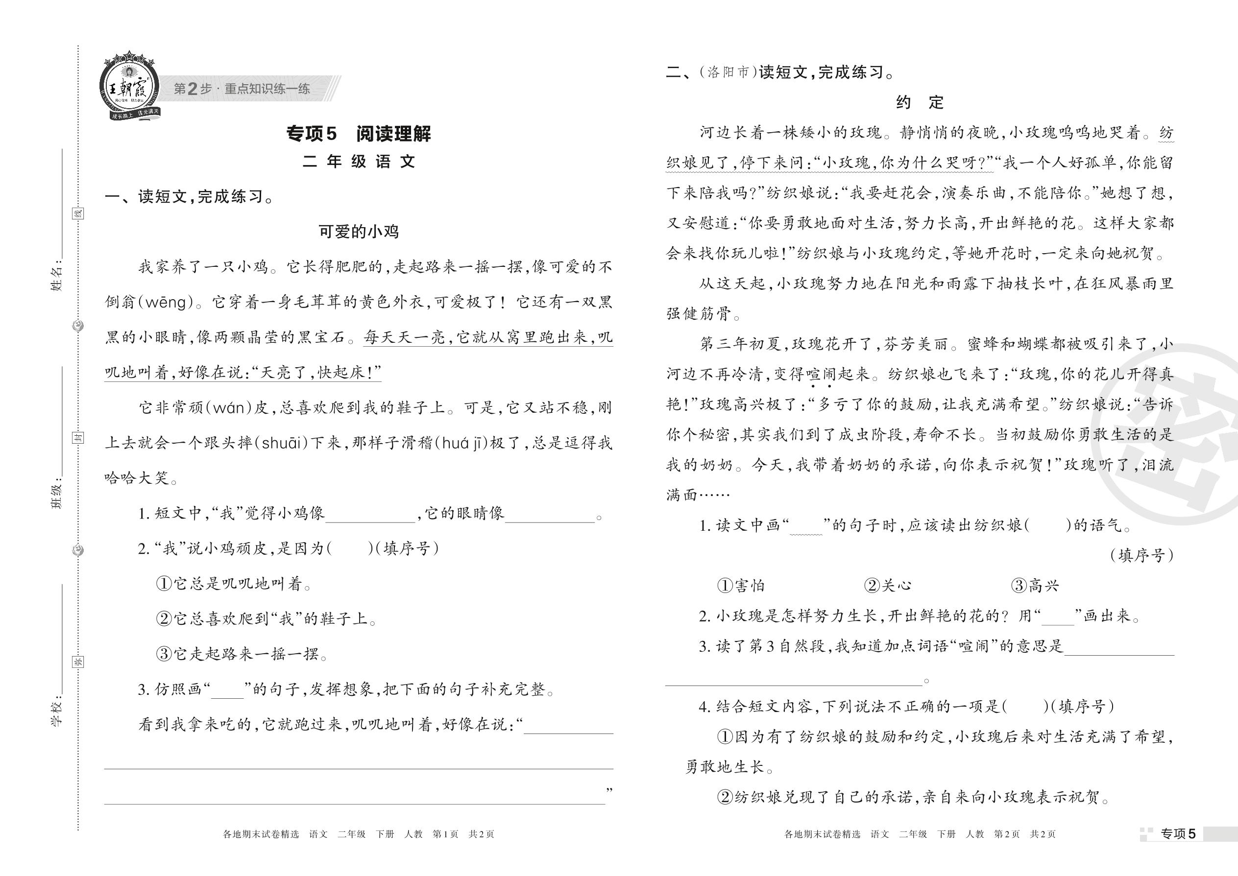 王朝霞期末专项卷——阅读理解二年级下册语文(人教版)【5】