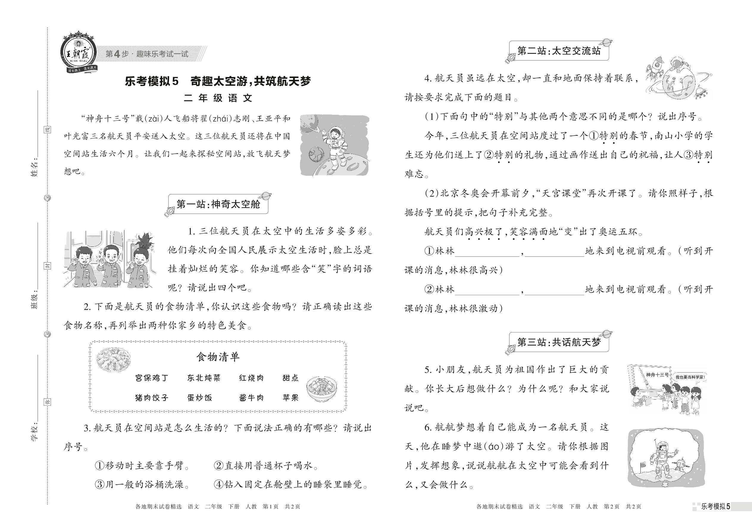 乐考模拟5 奇趣太空游,共筑航天梦二年级下册语文(人教版)