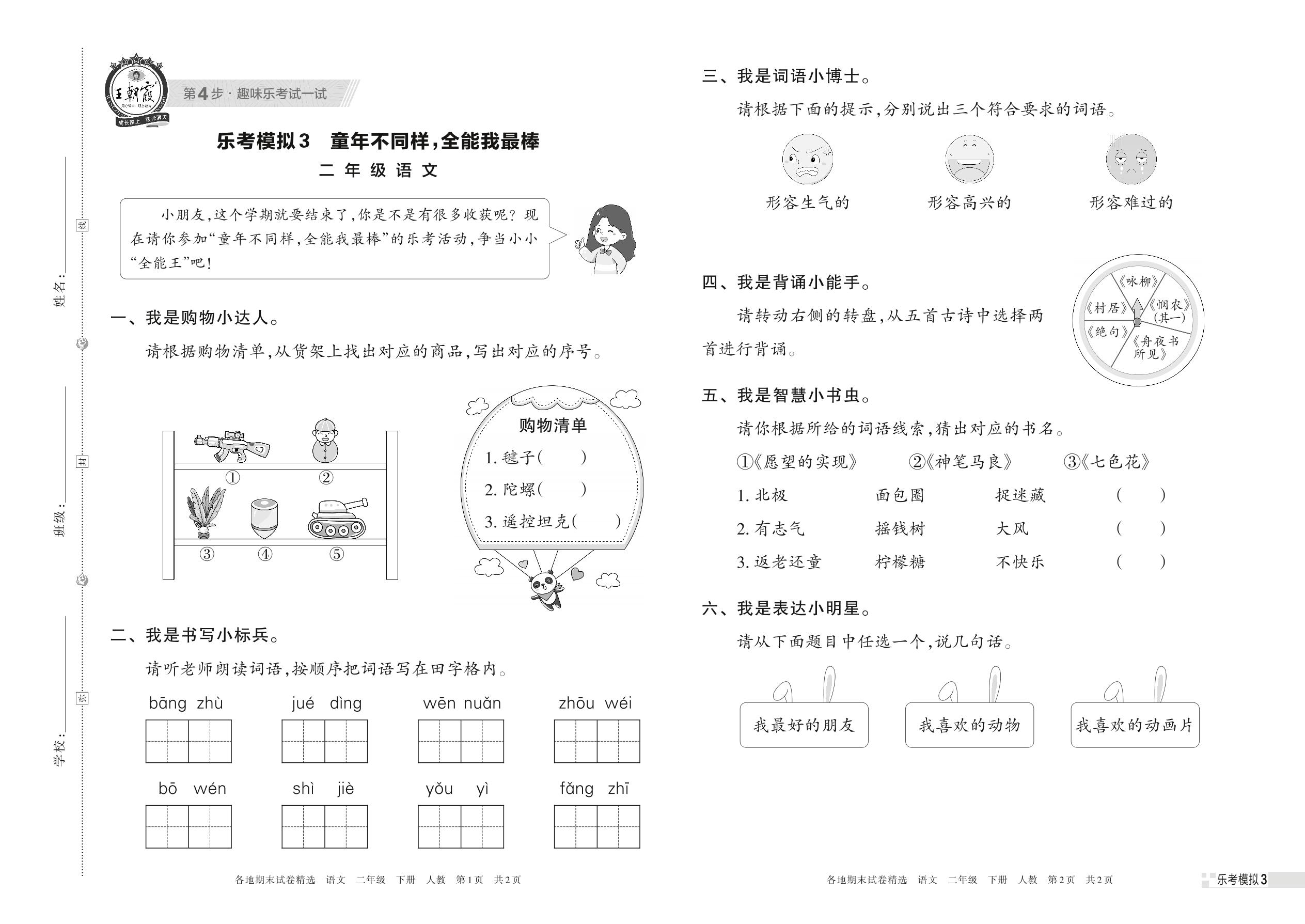 乐考模拟3 童年不同样,全能我最棒二年级下册语文(人教版)