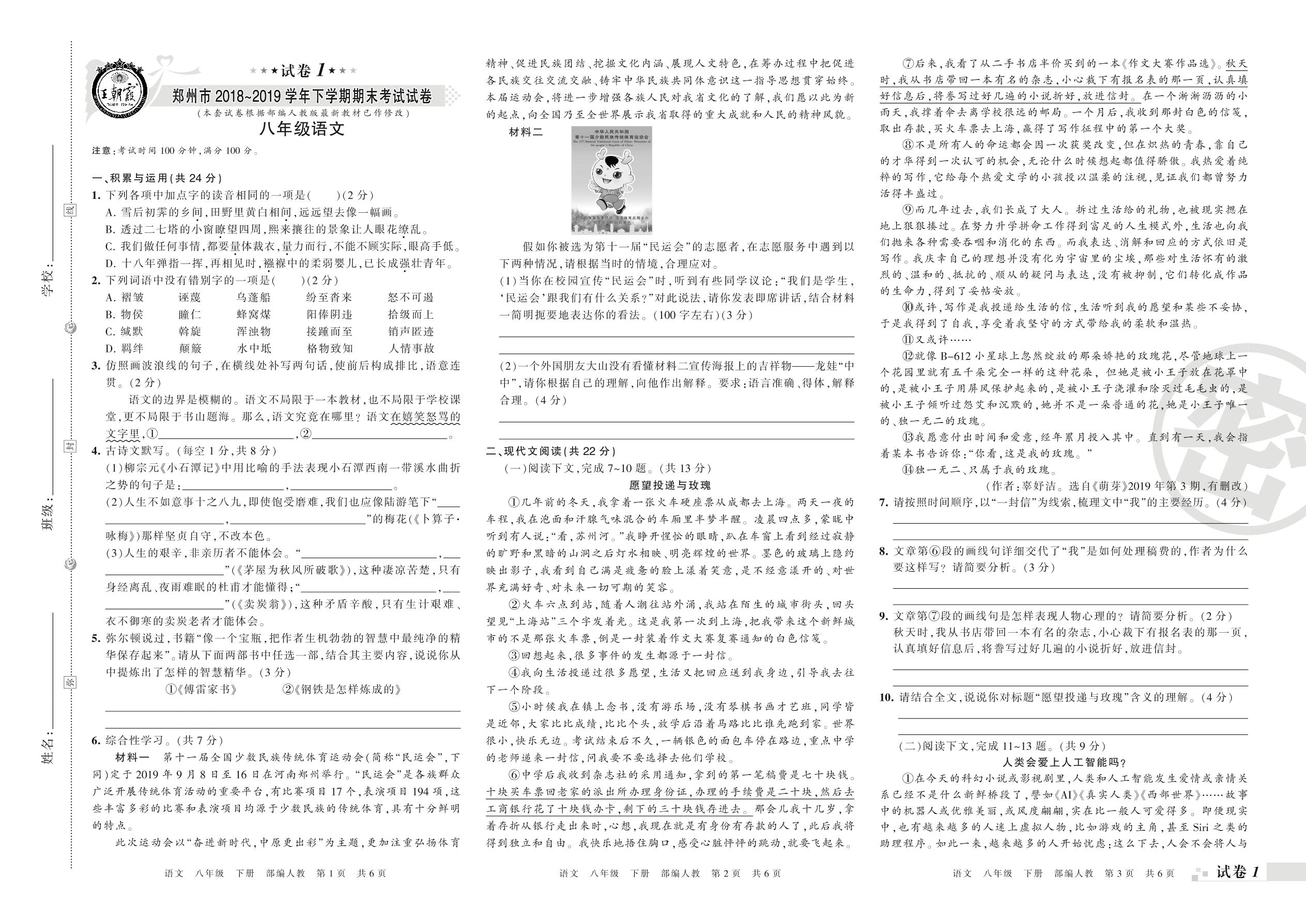 2018-2019学年第二学期郑州市八年级语文试卷(人教版)_R21080221931【1】