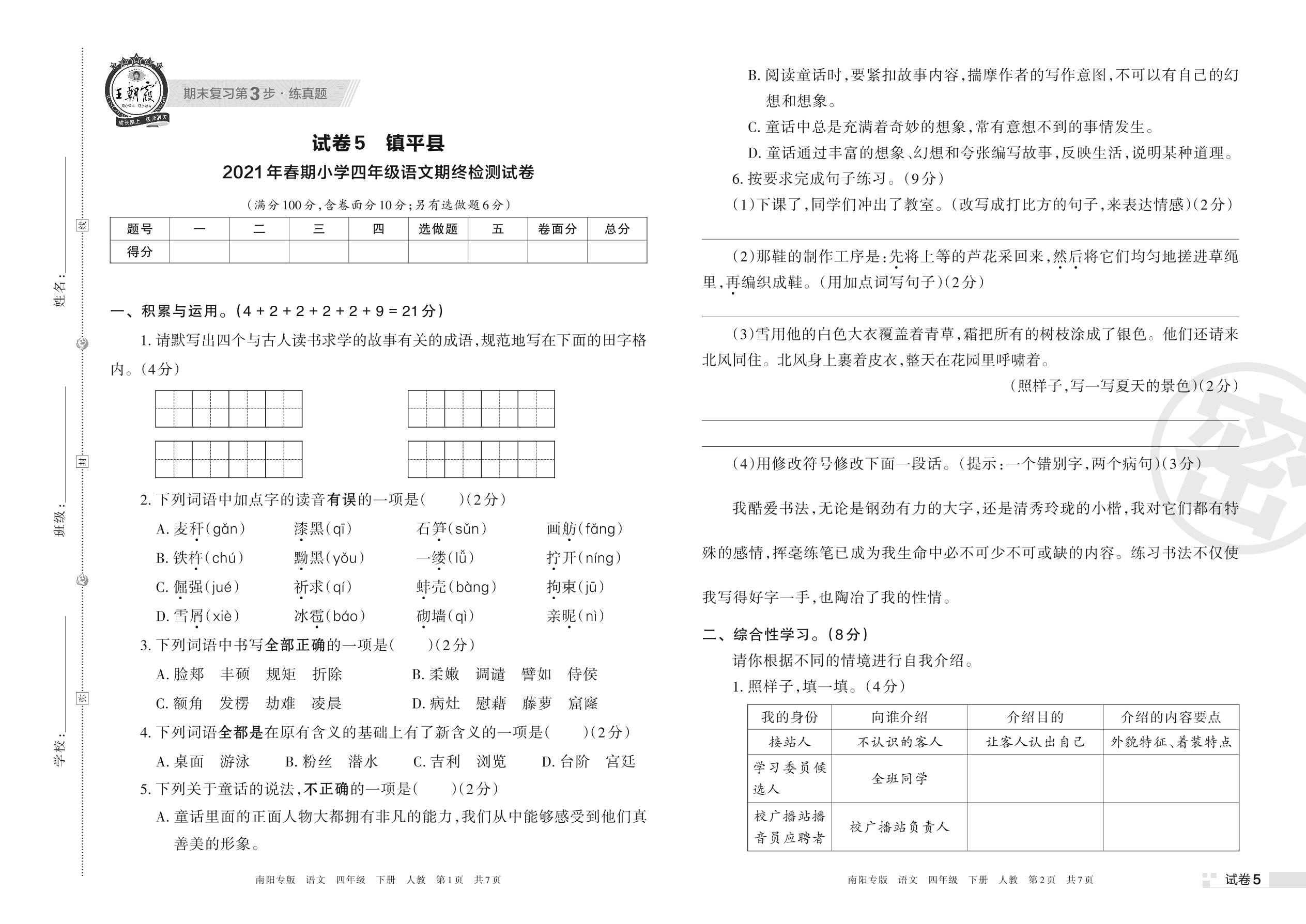 镇平县2021年春期小学四年级语文期终检测试卷(人教版)【5】