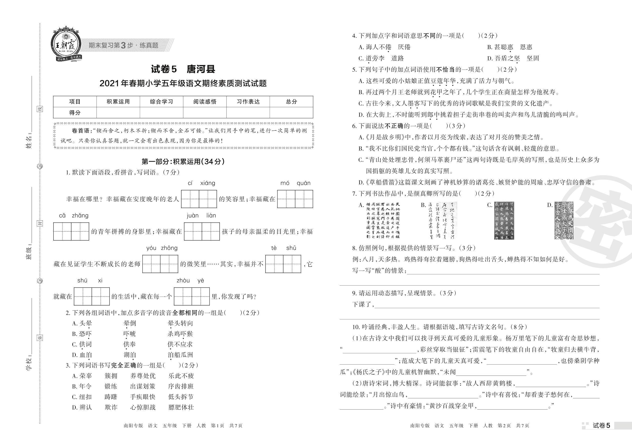 唐河县2021年春期小学五年级语文期终素质测试试题(人教版)【5】