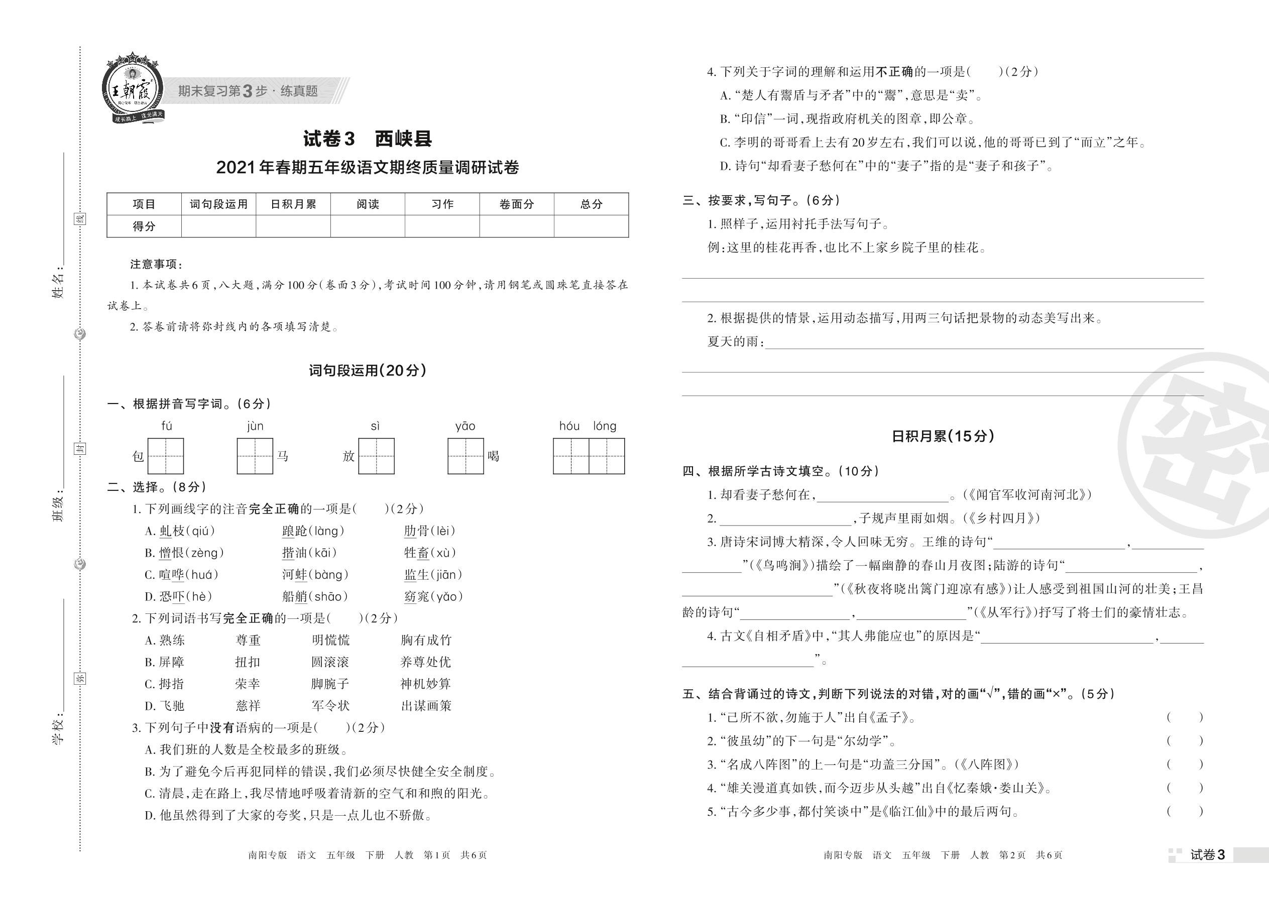 西峡县2021年春期五年级语文期终质量调研试卷(人教版)【3】
