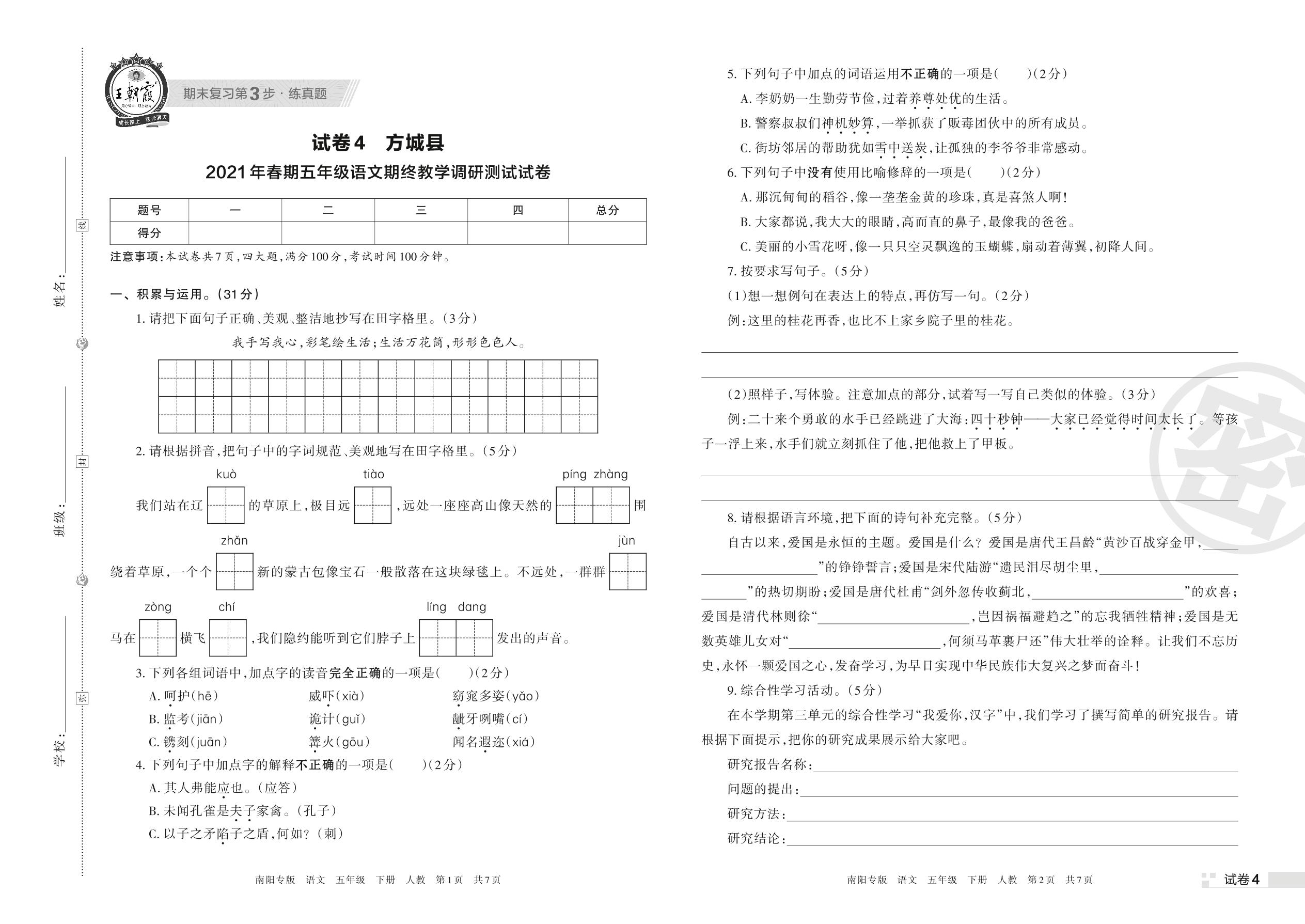 方城县2021年春期五年级语文期终教学调研测试试卷(人教版)【4】