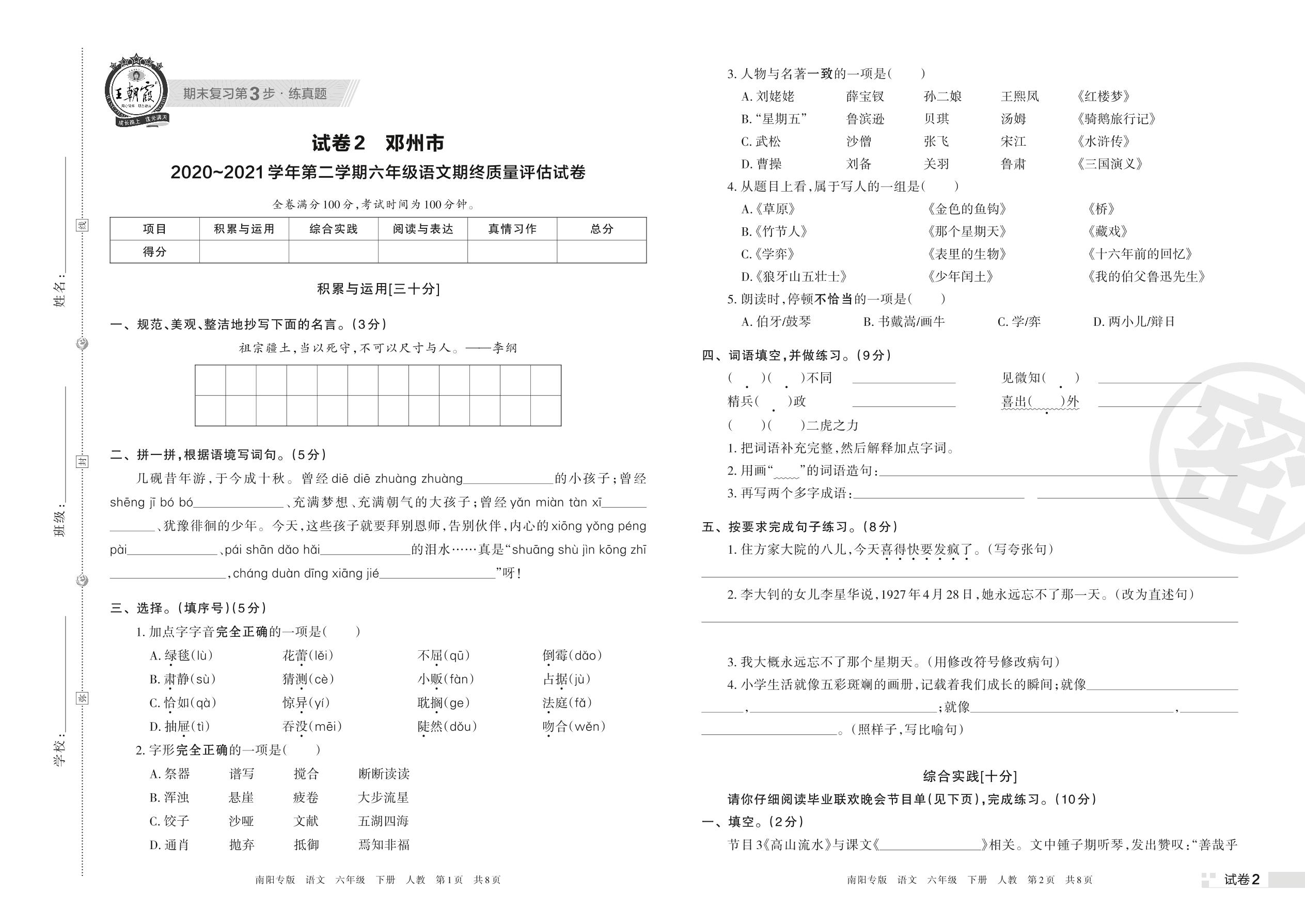 邓州市2020~2021学年第二学期六年级语文期终质量评估试卷(人教版)【2】