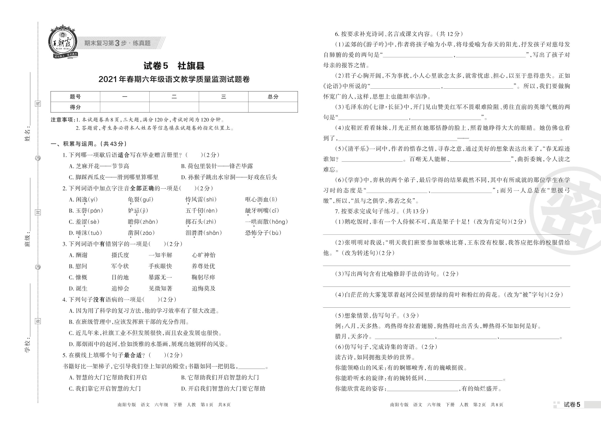 社旗县2021年春期六年级语文教学质量监测试题卷(人教版)【5】