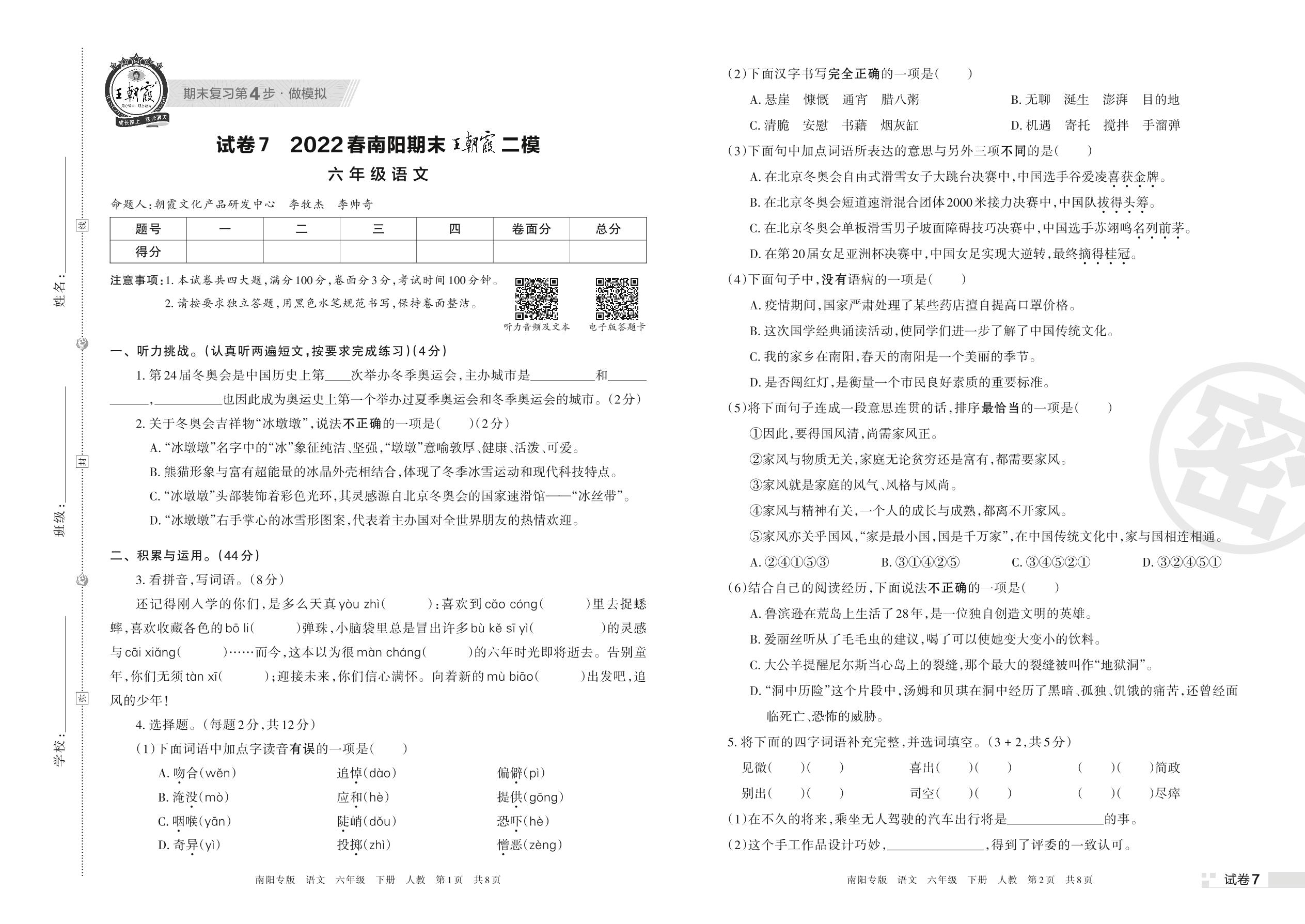 王朝霞期末模拟卷六年级下册语文(人教版)_R220408161412232【7】