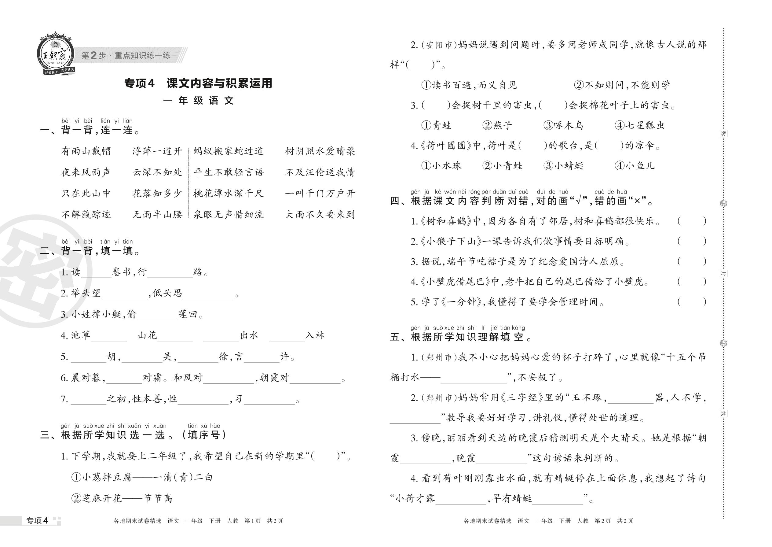 王朝霞期末专项卷——课文内容与积累运用一年级下册语文(人教版)【4】