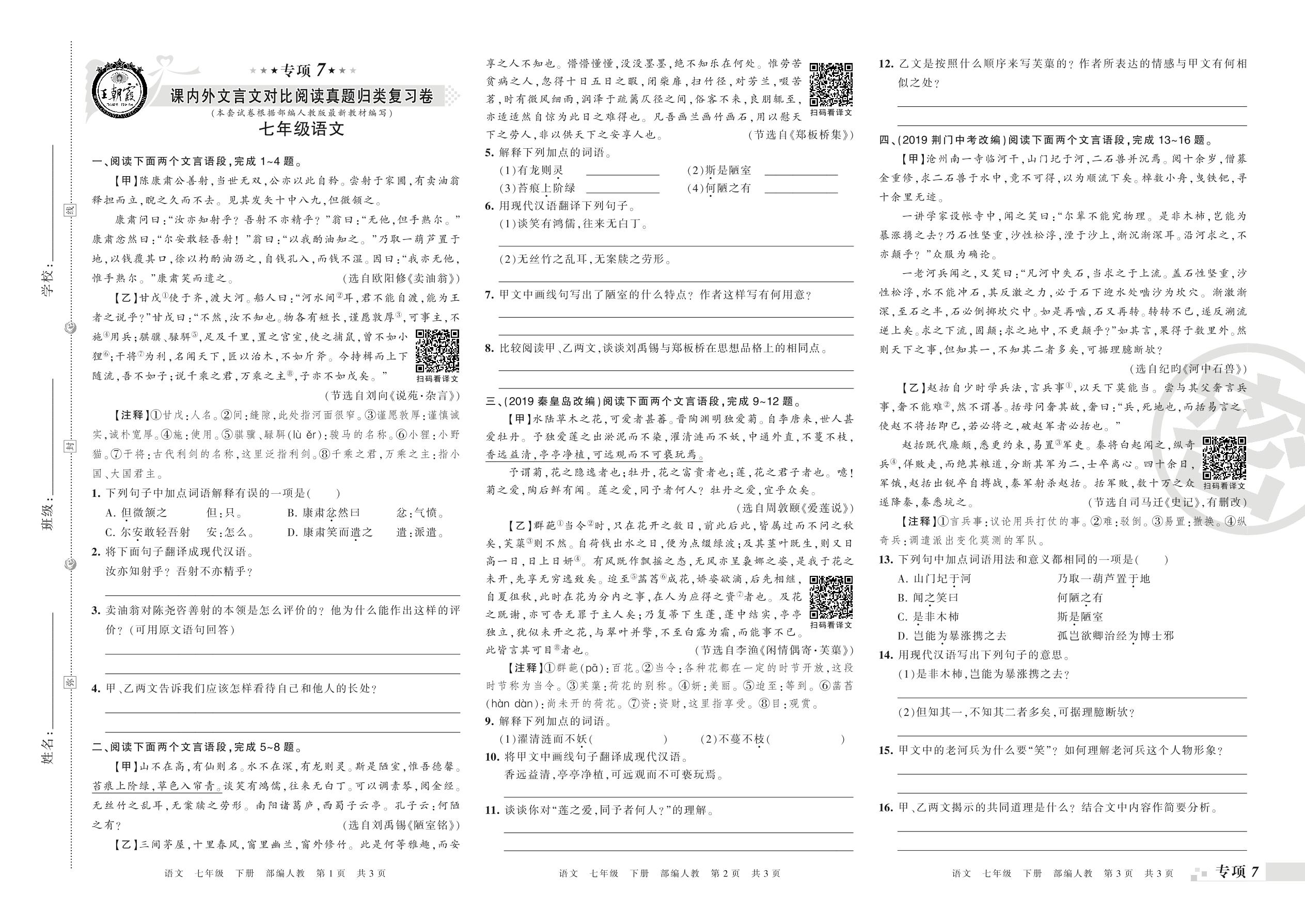 王朝霞期末专项卷——课内外文言文对比阅读、古诗词阅读真题归类复习卷七年级下册语文(人教版)_R21080222146【0】