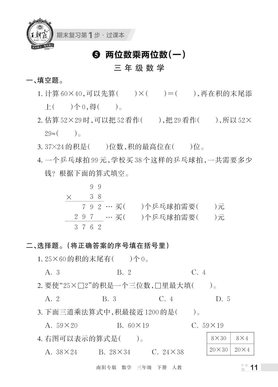 王朝霞期末过课本——5 两位数乘两位数(一)三年级下册数学(人教版)_R220408162403069