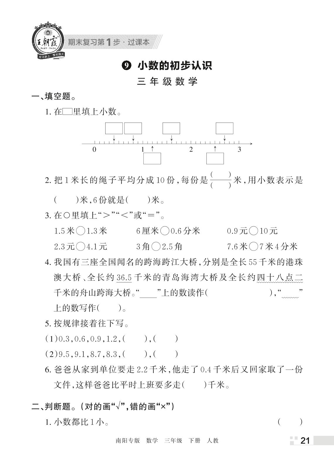 王朝霞期末过课本——9 小数的初步认识三年级下册数学(人教版)_R220408162403898
