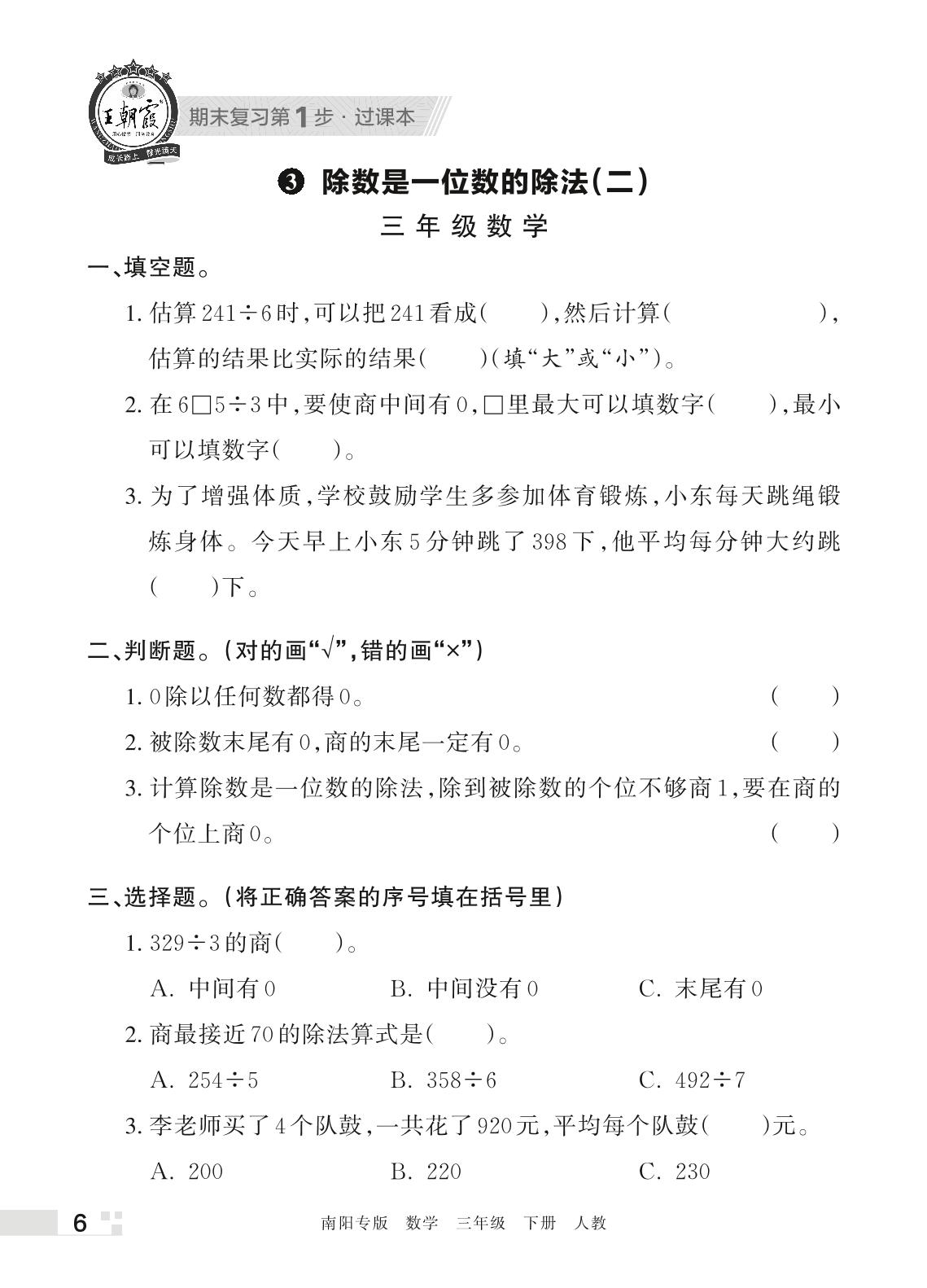王朝霞期末过课本——3 除数是一位数的除法(二)三年级下册数学(人教版)_R220408162404125