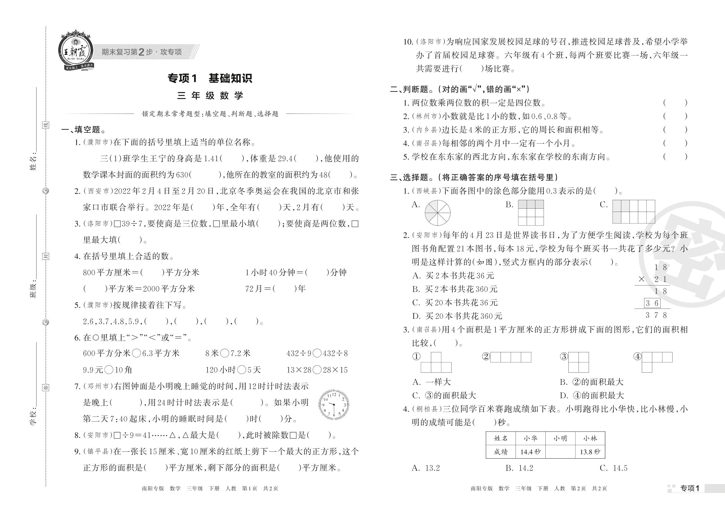 王朝霞期末专项卷——基础知识三年级下册数学(人教版)_R220408162404464【1】