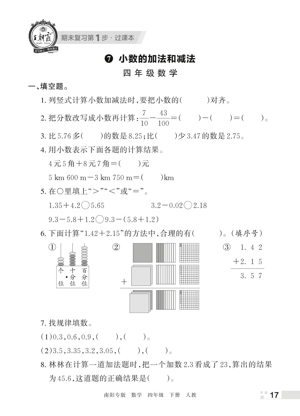 王朝霞期末过课本——7 小数的加法和减法四年级下册数学(人教版)_R220408162935793