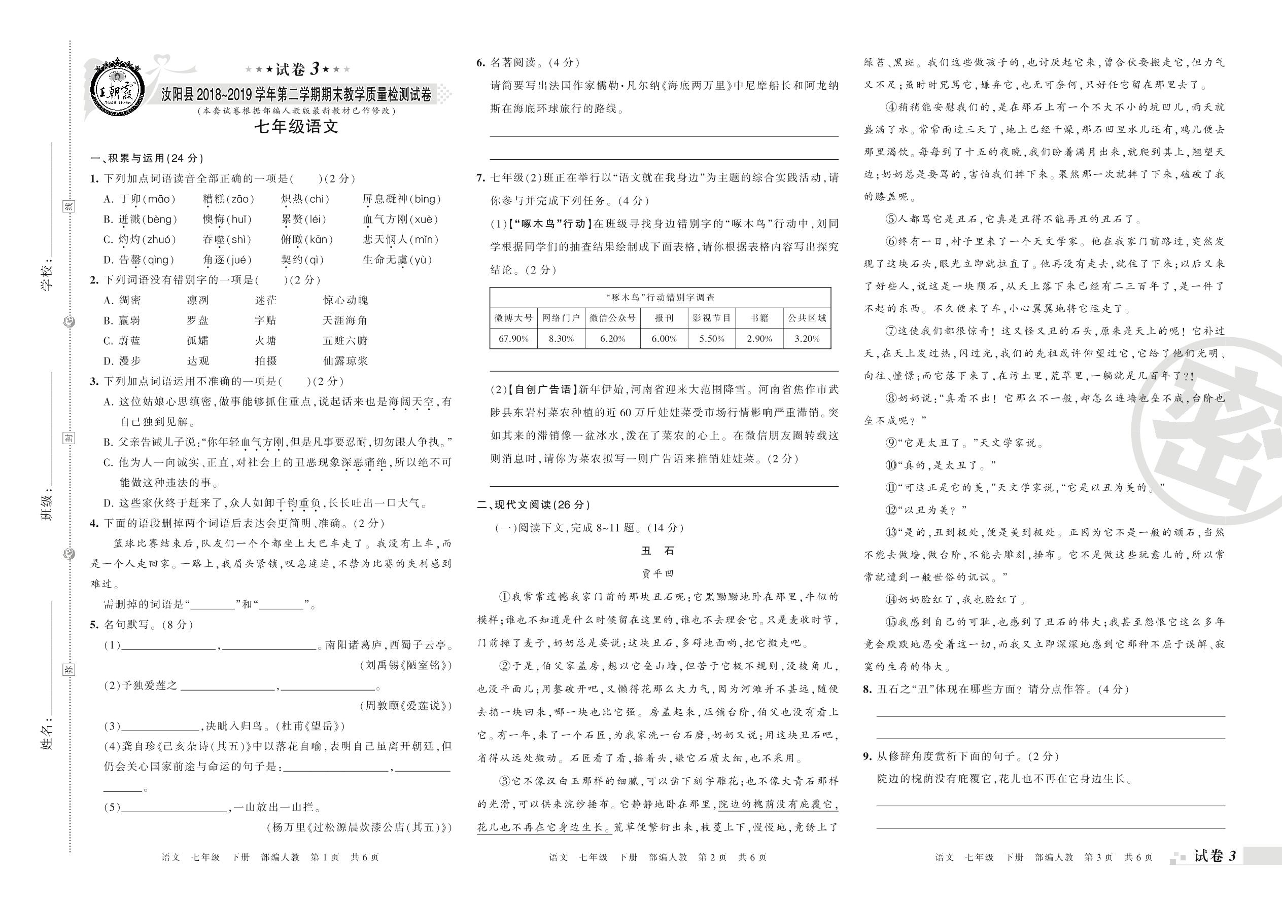 2018-2019学年第二学期洛阳市汝阳县七年级语文试卷(人教版)【3】