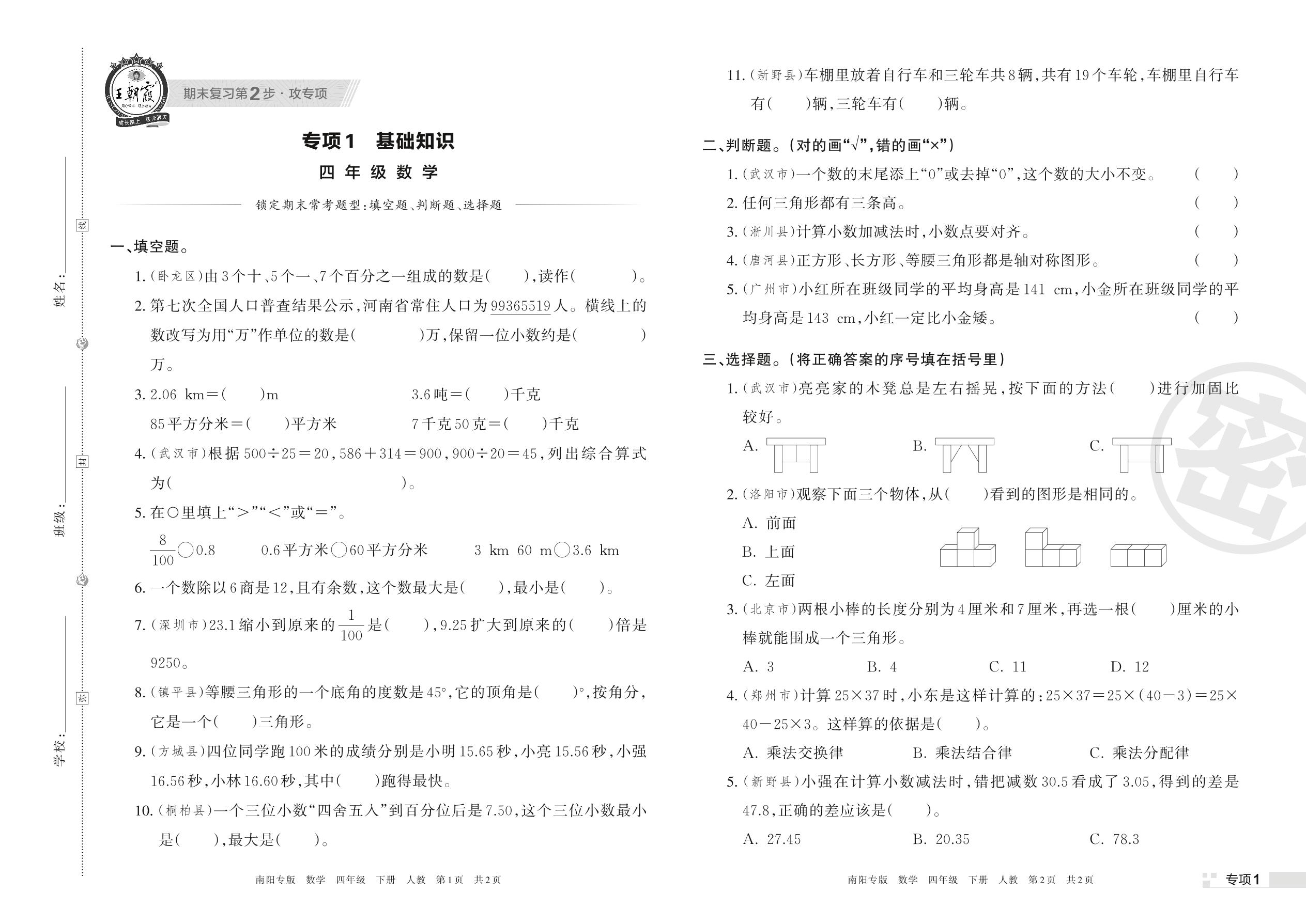 王朝霞期末专项卷——基础知识四年级下册数学(人教版)_R220408162936603【1】