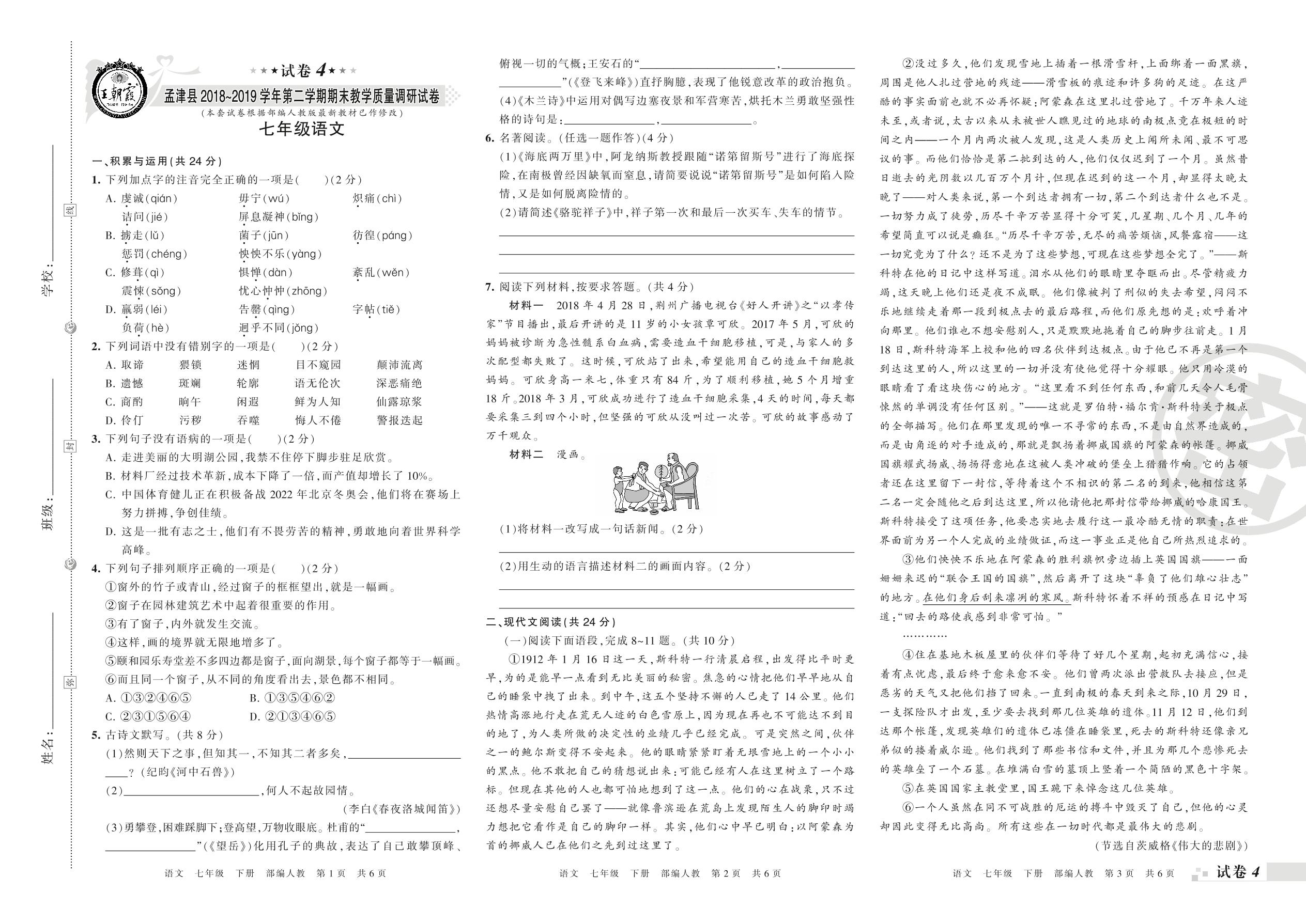 2018-2019学年第二学期洛阳市孟津县七年级语文试卷(人教版)【4】