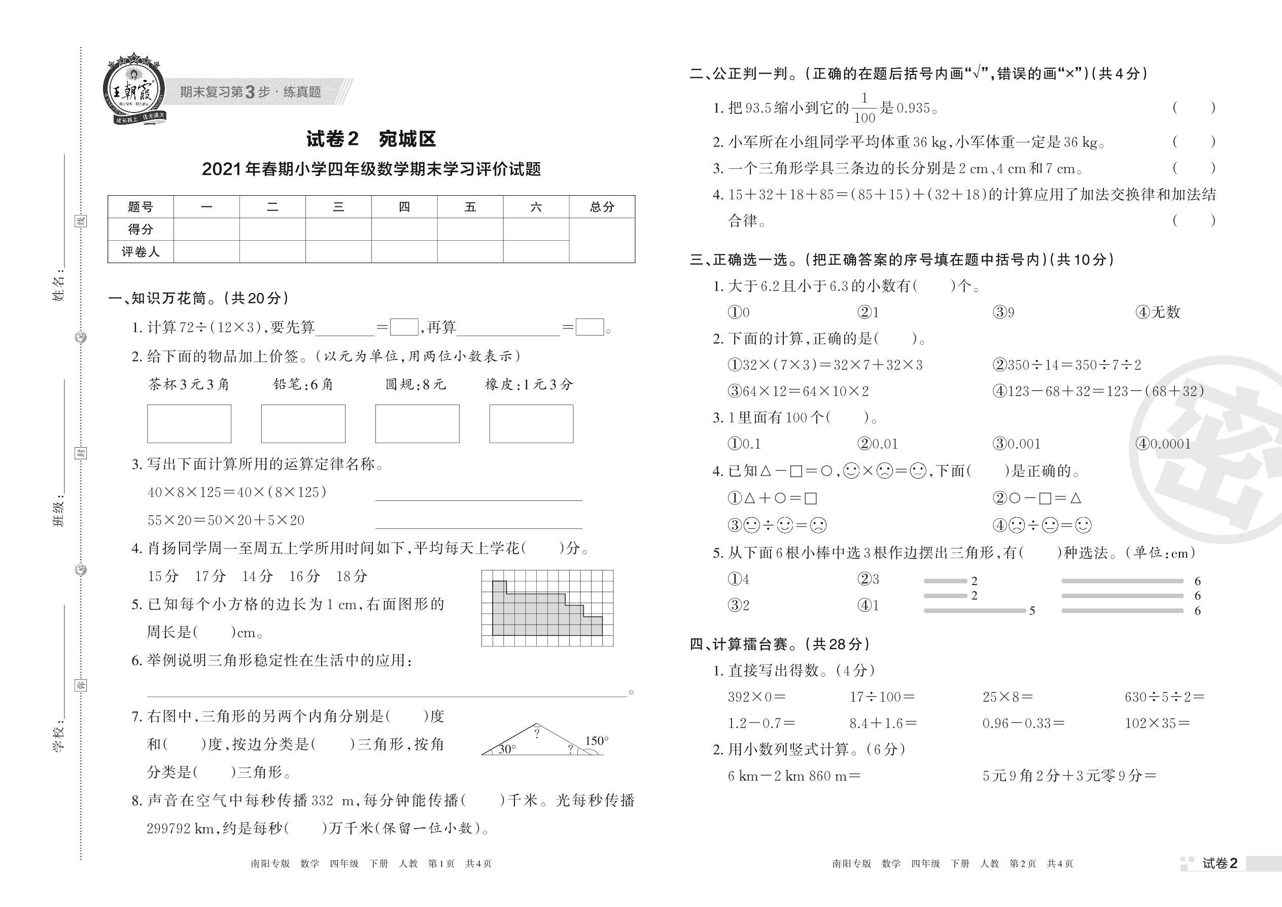 宛城区2021年春期小学四年级数学期末学习评价试题(人教版)【2】