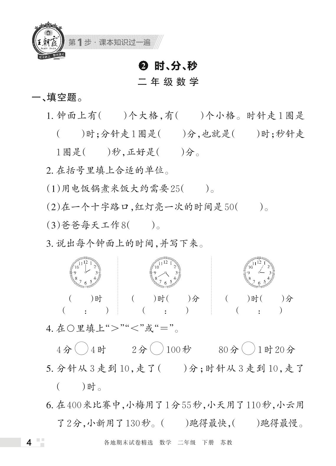 王朝霞期末过课本——2 时、分、秒二年级下册数学(苏教版)