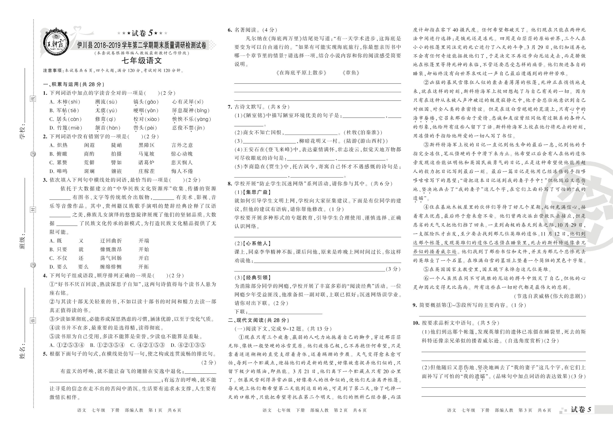 2018-2019学年第二学期洛阳市伊川县七年级语文试卷(人教版)【5】