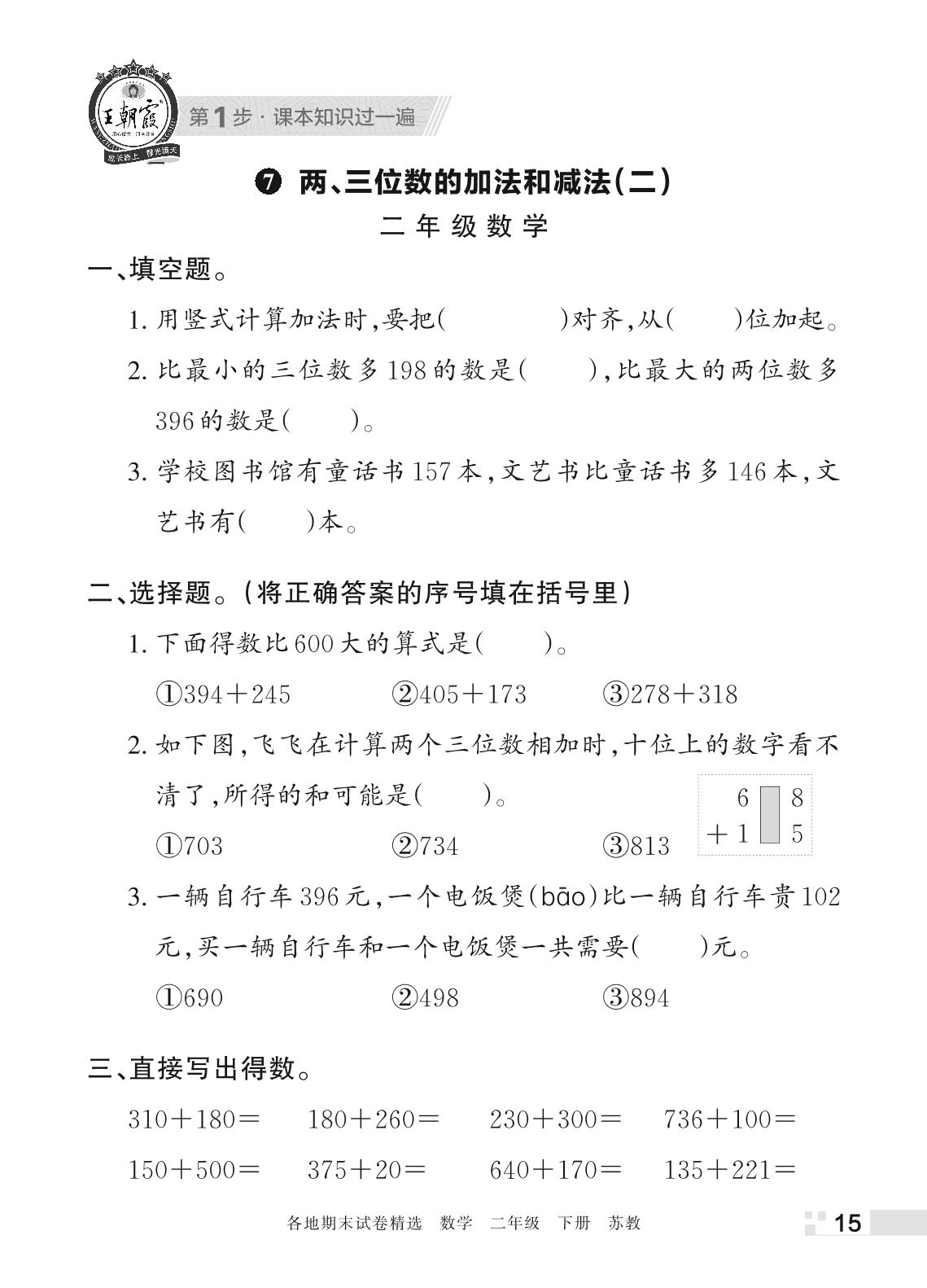 王朝霞期末过课本——7 两、三位数的加法和减法(二)二年级下册数学(苏教版)