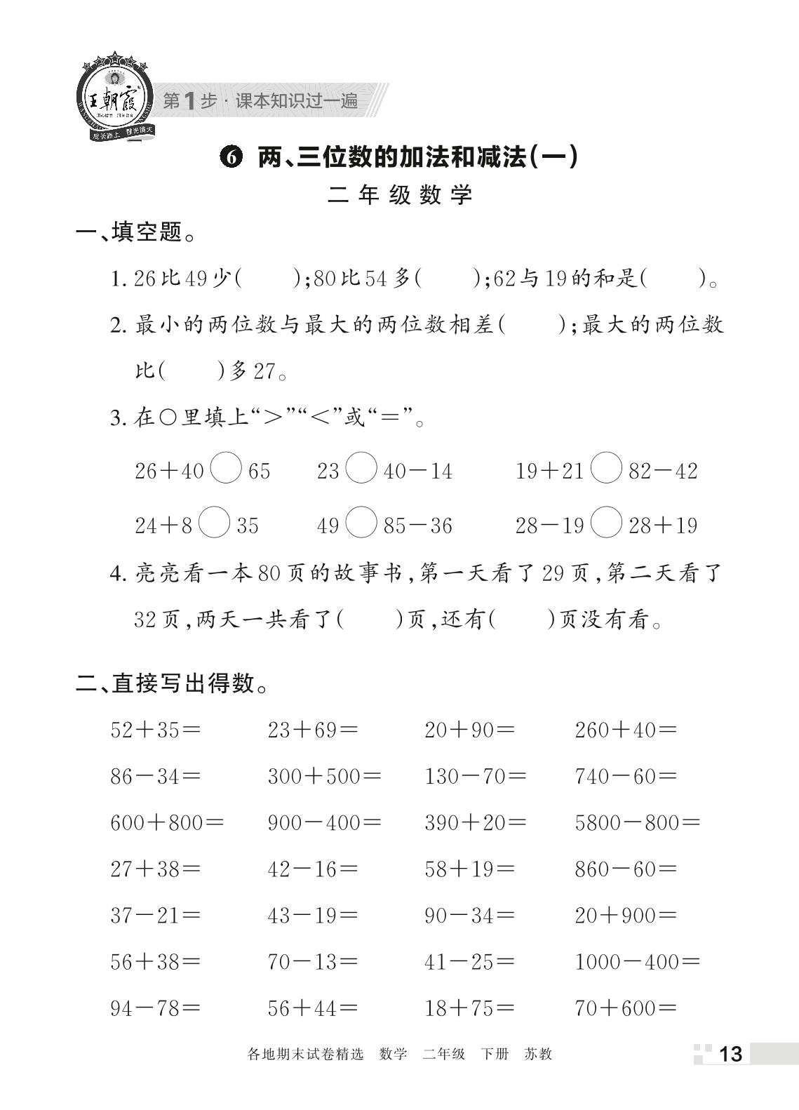 王朝霞期末过课本——6 两、三位数的加法和减法(一)二年级下册数学(苏教版)