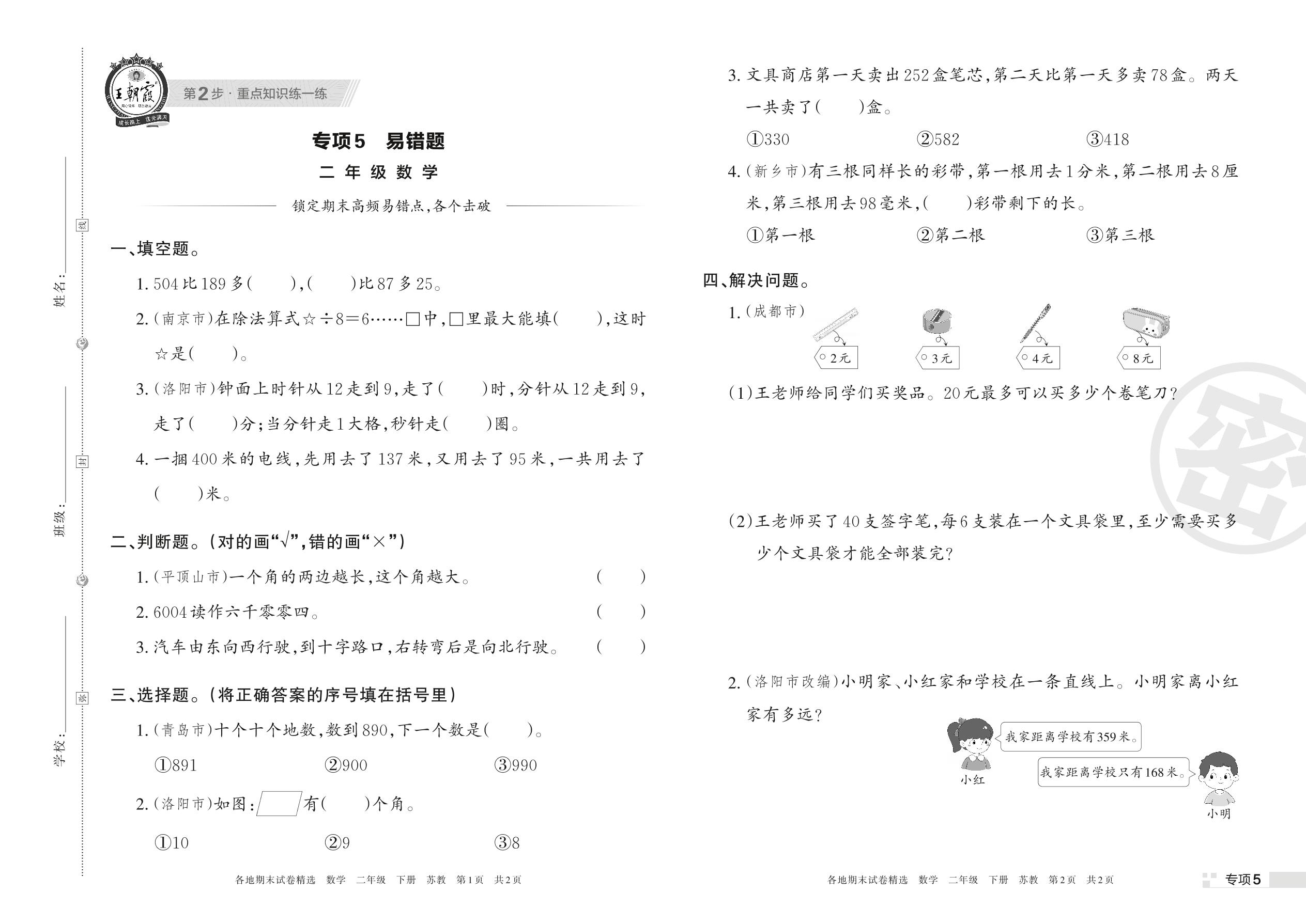 王朝霞期末专项卷——易错题二年级下册数学(苏教版)【5】
