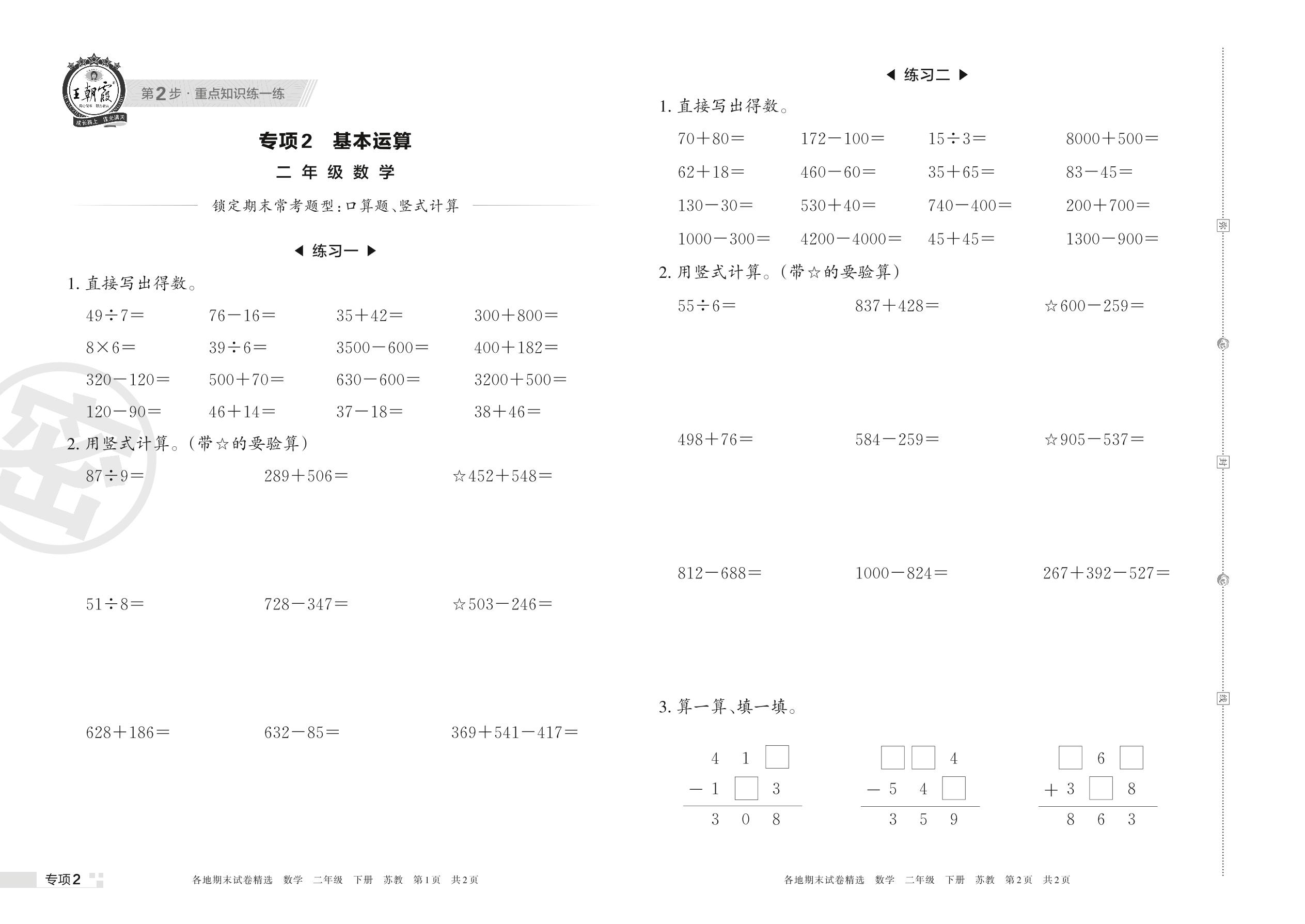 王朝霞期末专项卷——基本运算二年级下册数学(苏教版)【2】