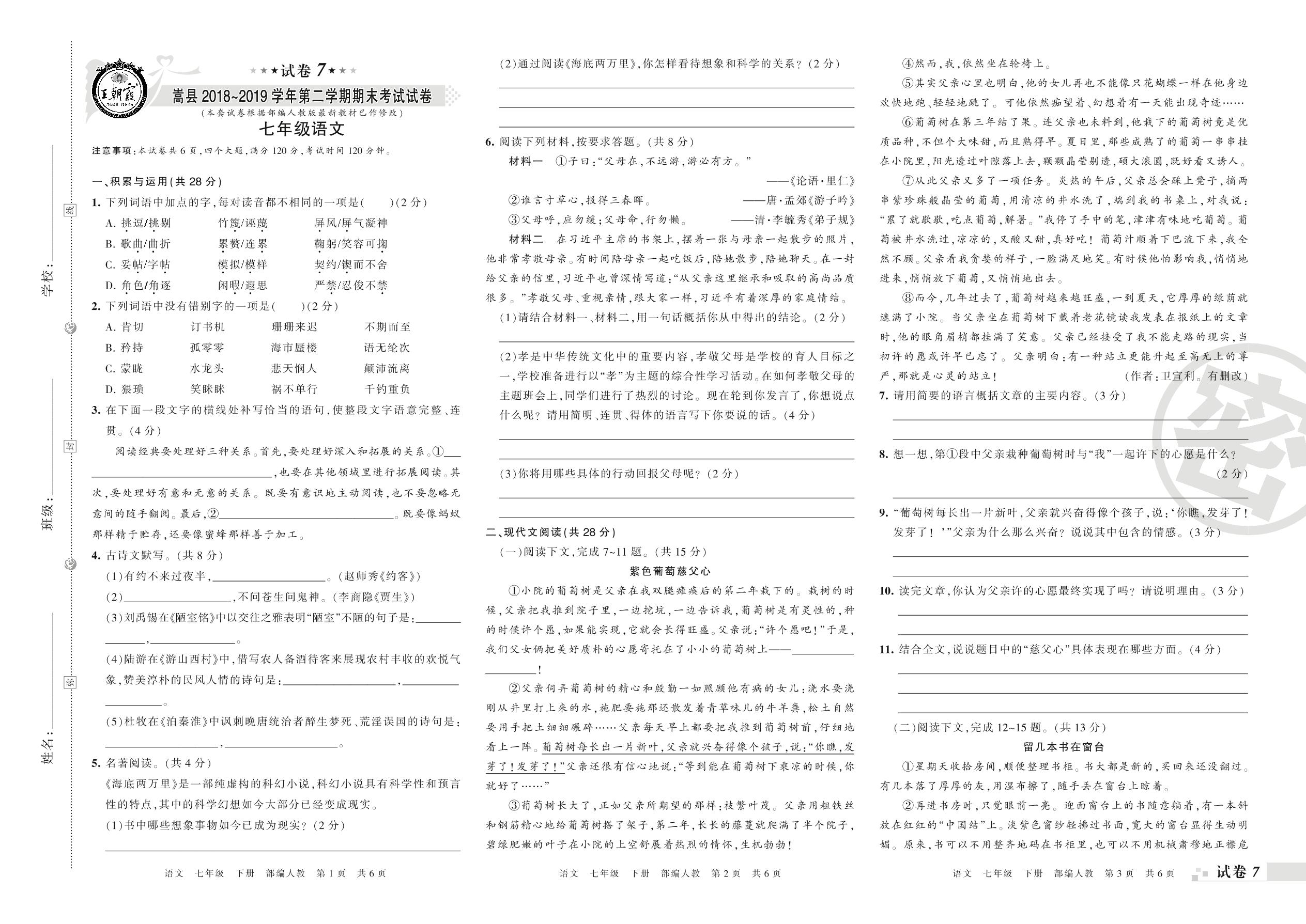 2018-2019学年第二学期洛阳市嵩县七年级语文试卷(人教版)【7】