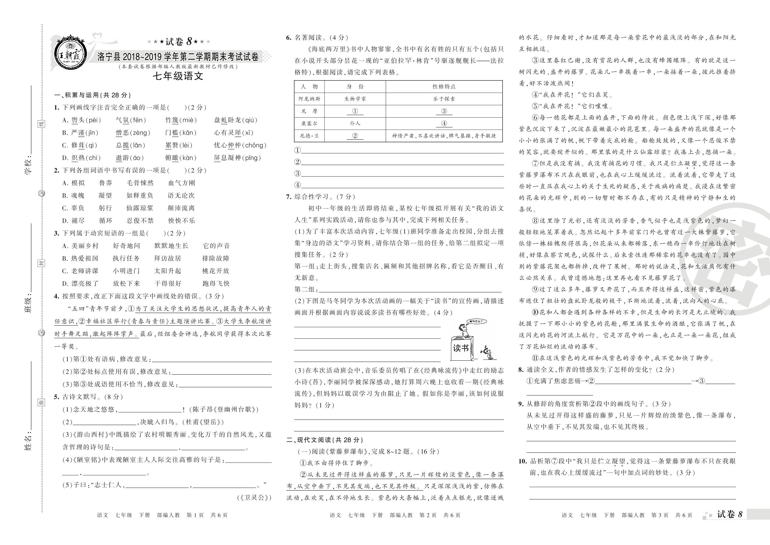 2018-2019学年第二学期洛阳市洛宁县七年级语文试卷(人教版)【8】