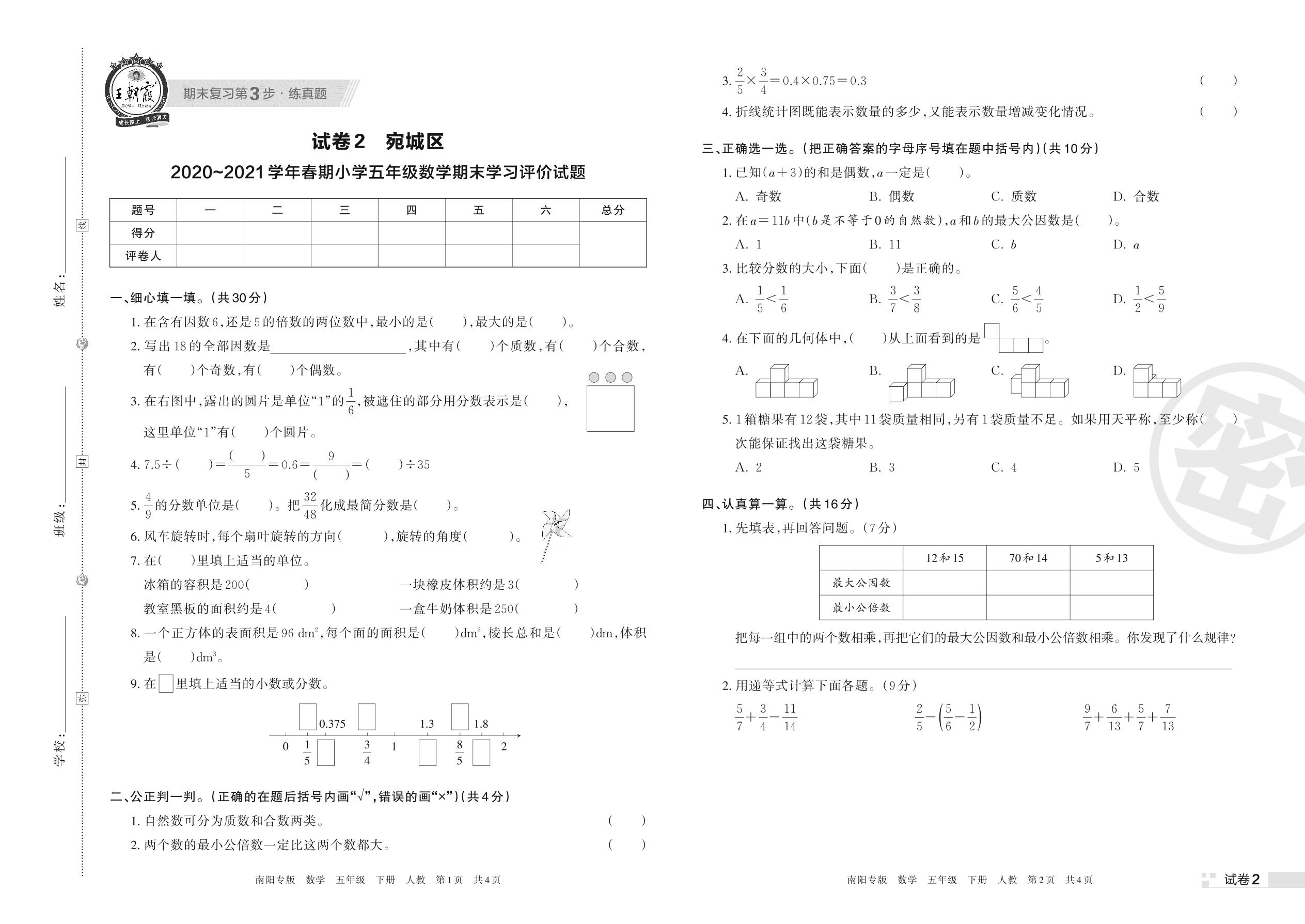 宛城区2020~2021学年春期小学五年级数学期末学习评价试题(人教版)【2】
