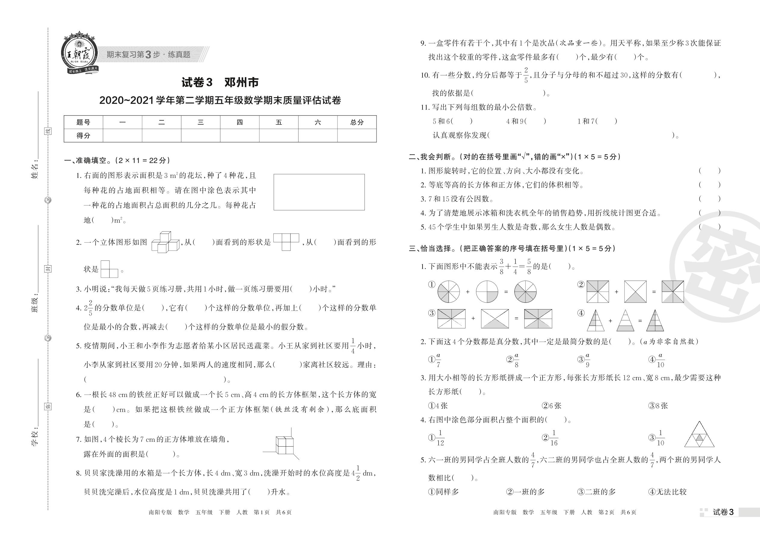 邓州市2020~2021学年第二学期五年级数学期末质量评估试卷(人教版)【3】