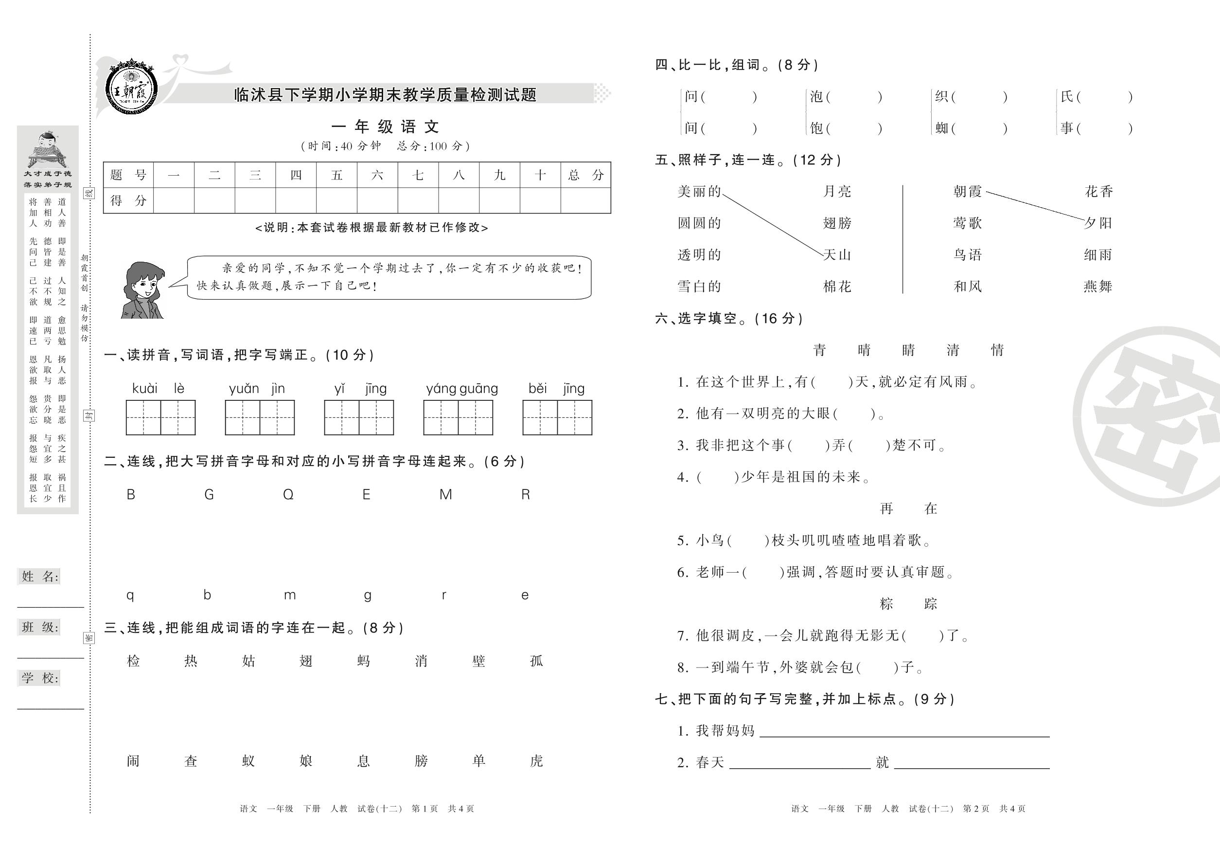 2015-2016学年第二学期临沂市临沭县一年级语文试卷(人教版)【12】