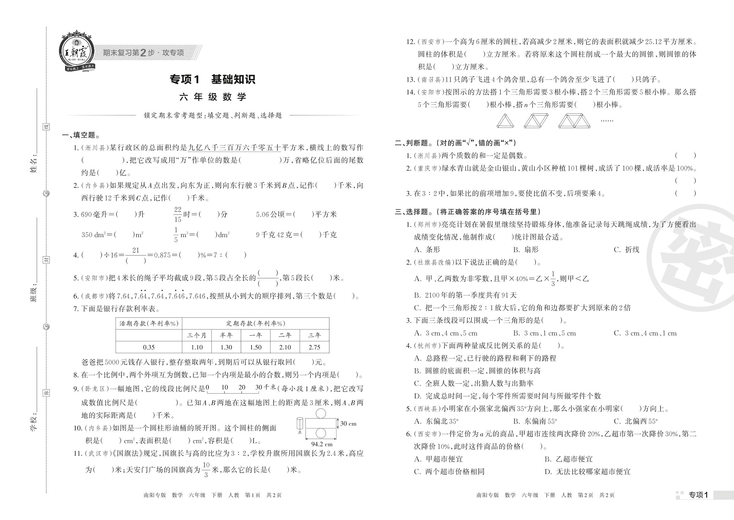 王朝霞期末专项卷——基础知识六年级下册数学(人教版)_R220408164108553【1】