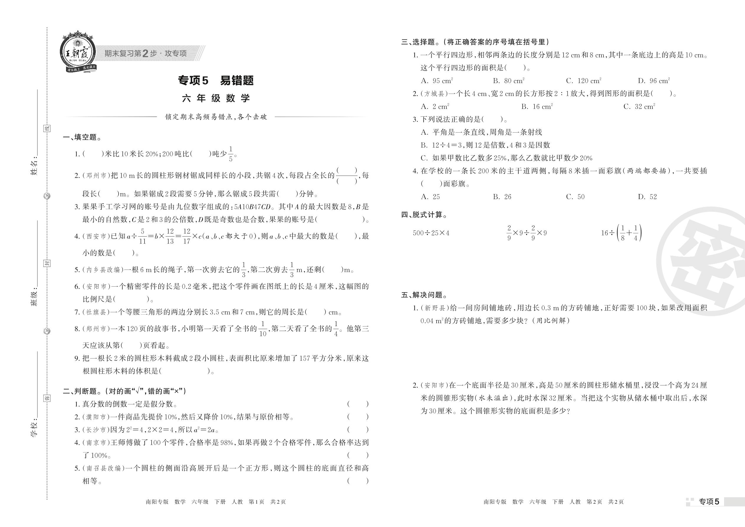 王朝霞期末专项卷——易错题六年级下册数学(人教版)_R220408164108910【5】