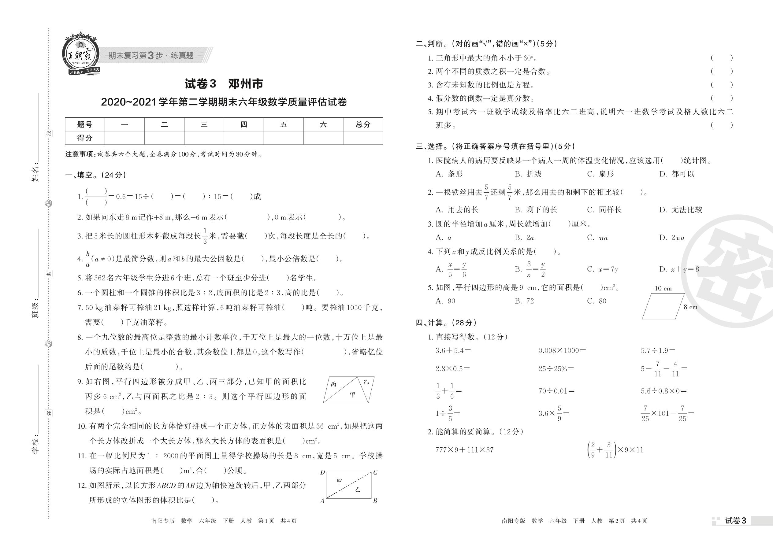 邓州市2020~2021学年第二学期期末六年级数学质量评估试卷(人教版)【3】