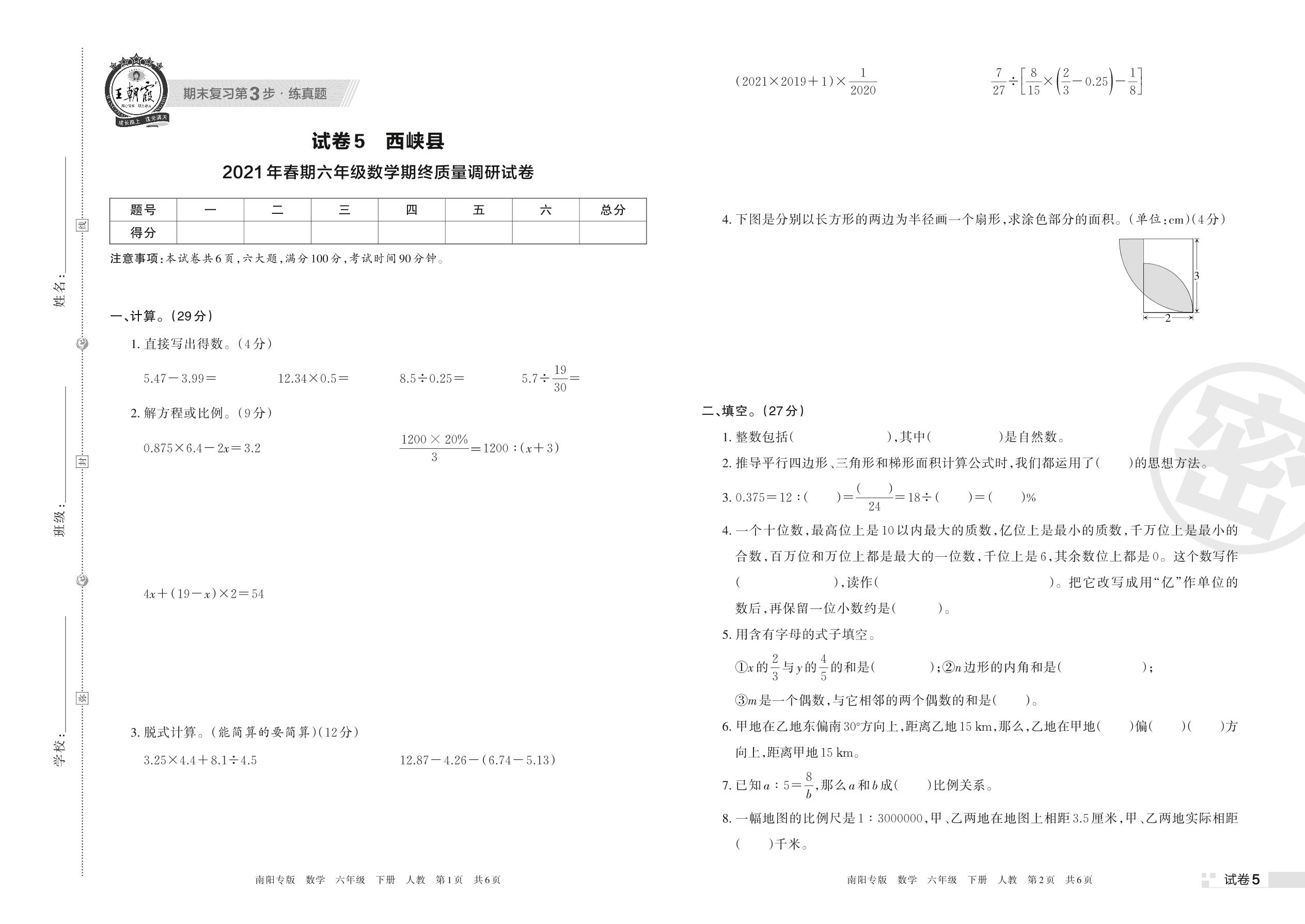 西峡县2021年春期六年级数学期终质量调研试卷(人教版)【5】